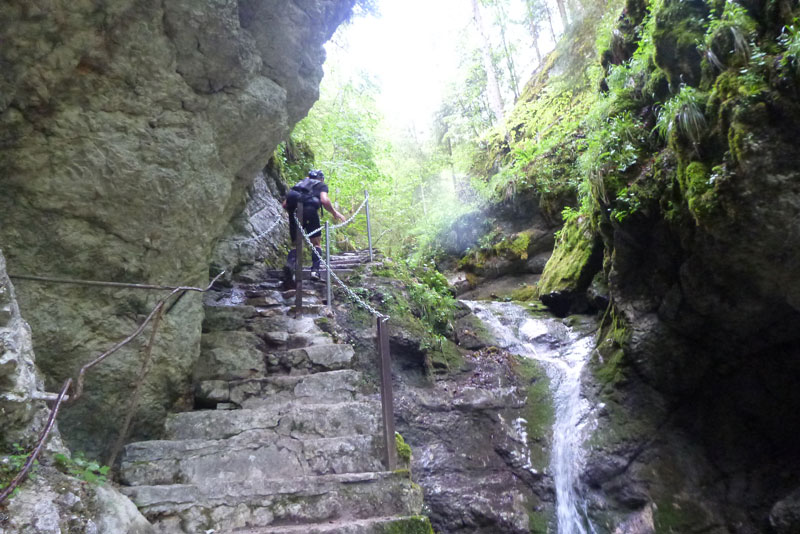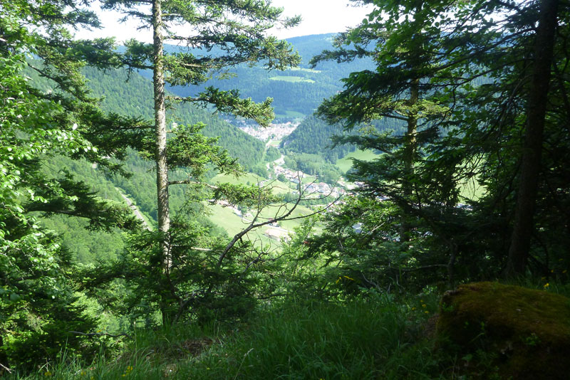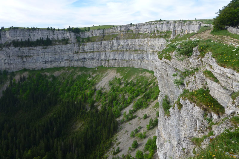 Normalerweise sichern sich in diesem 25 Quadratkilometer großen Naturschutzgebiet Steinböcke, Gämsen und Luchse die Logenplätze, heute dürfen wir ihren Platz einnehmen. Die Strecke führt ein paar Meter hinter der Kante an einer Felsenmauer entlang, man hat in Abständen schmale Einschnitte eingearbeitet, so kann man bis direkt an die Abrisskante gelangen. Ich gönne mir mehrmals diese kleinen Abweichungen von der Laufstrecke, die verlorene Zeit spielt da eine untergeordnete Rolle, ich will die Naturwunder auch richtig erleben, nicht nur im vorbeihuschen. An der Kante geht die sanfte Juralandschaft urplötzlich in die senkrecht abfallende Felswand über, ohne eine Absperrung, es ist atemberaubend. Ich muss tief Luft holen.