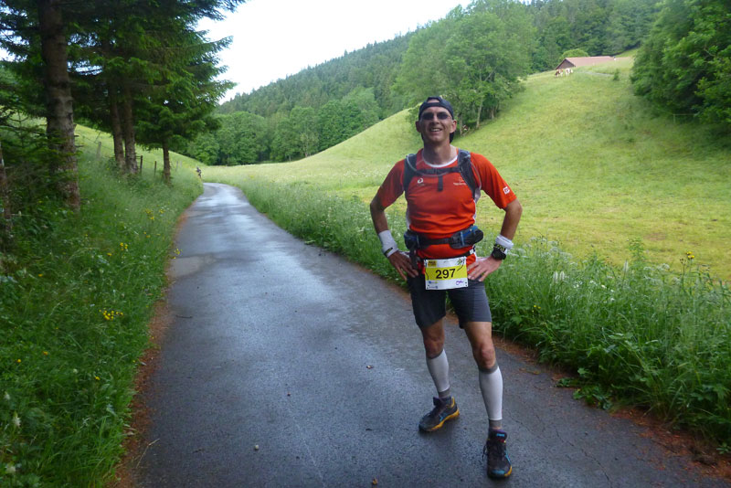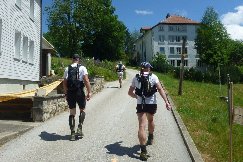 Um 5:30 Uhr stehen wir wieder, aufgepumpt mit Adrenalin, an der Startlinie zu unserem exklusiven Single-Late-Start. Die Zeitnehmer haben uns registriert und die Startnummern notiert, so kann’s endlich losgehen. Eine Viertelstunde vom Zeitlimit ist aber bereits aufgebraucht, die Uhr läuft auch für uns seit dem Start des „Vorkommandos“. Die ersten 9 Kilometer verlaufen ganz flach im Tal auf kleinen Straßen, meist an der L‘Areuse entlang, die durch das ganze Val de Travers fließt. Gefühlsmäßig viel zu schnell sind Jan und ich unterwegs. Nach 5 km können wir aber dafür bereits das Schlusslicht des vor uns gestarteten Feldes einholen und wenig später gleich noch einmal zwei Starter schnappen. Das macht uns Spaß, die nächsten beiden liegen bereits im Visier.