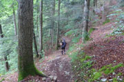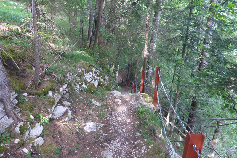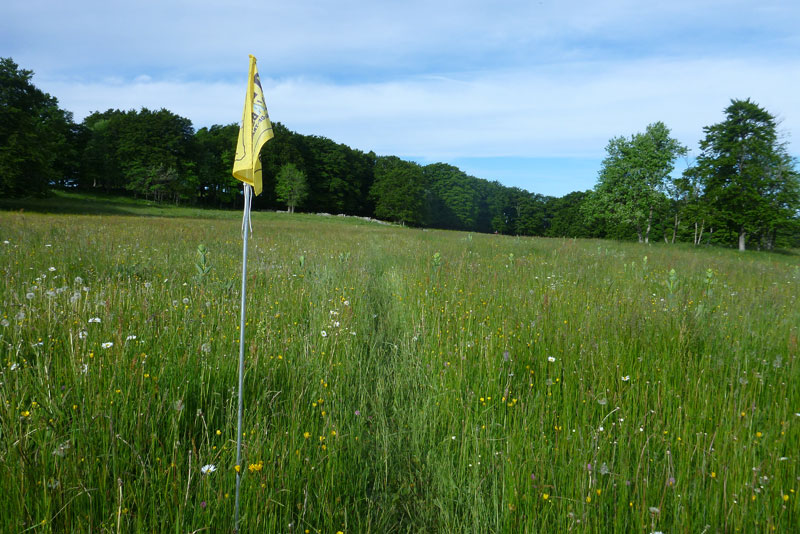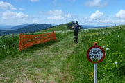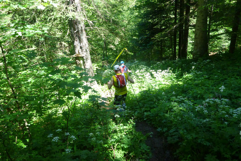 Sehr abwechslungsreich führt der Weg hinunter ins Tal. Immer wieder führen uns die Wegweiser direkt durch meterhohe blühende Wiesen, wo man nur noch den niedergetretenen Gräsern der Vorläufer folgen kann oder Ausschau nach einem Fähnchen halten muss, um die Fährte im Blick zu behalten. An kritischen Stellen sind aber Helfer postiert, ich werde heute mehrmals zurückgepfiffen. Manchmal sind auch längere Abschnitte über Schotterwege und kurze Asphaltstücke dabei. Hier kann man viel Zeit gutmachen, der 13 Kilometer lange Bergab-Teil ist meist problemlos in höherem Lauftempo zu bewältigen.