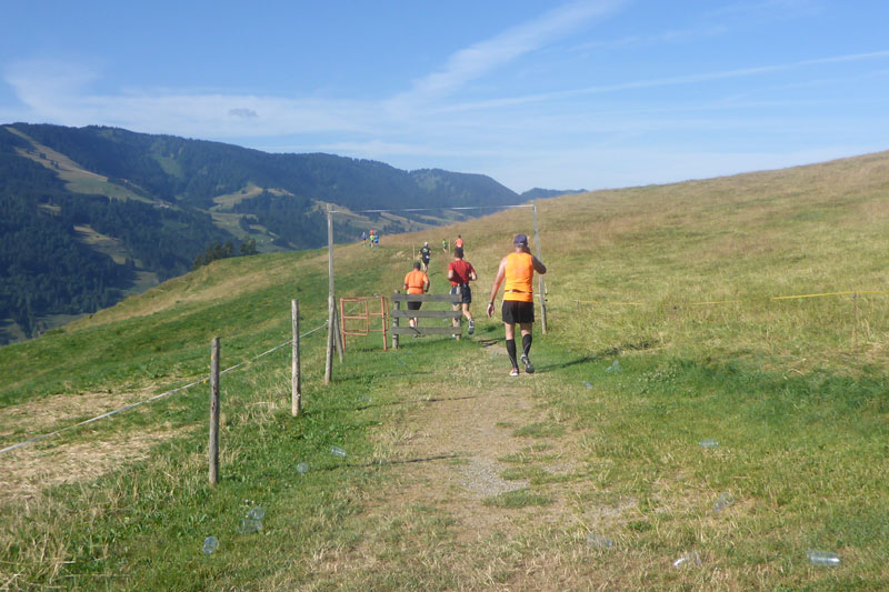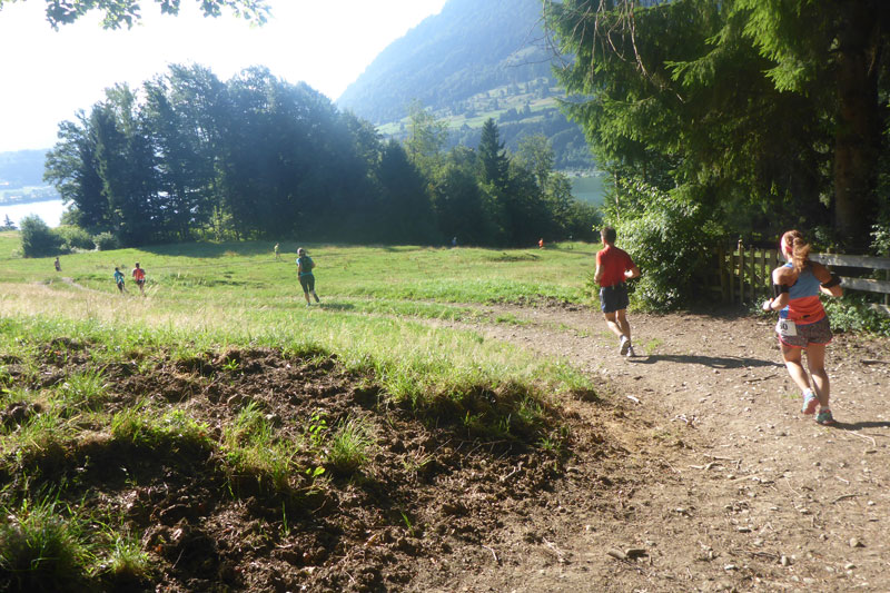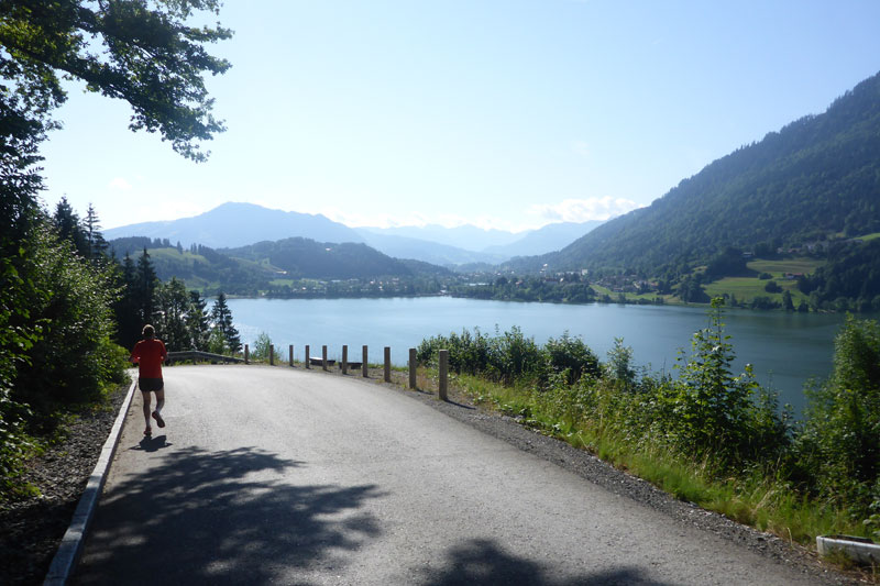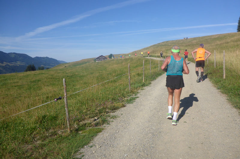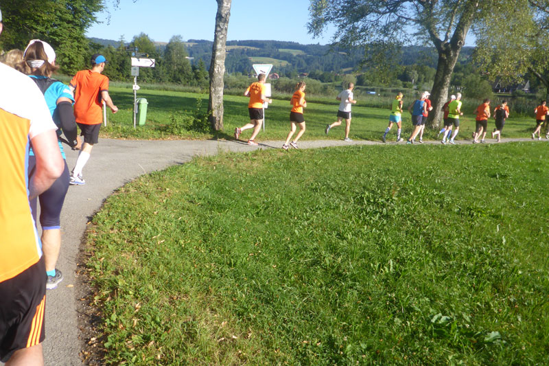Als wir in Ratholz die Bundesstraße unterqueren, sind wir am Fuß der „Alpsee Bergwelt“. Dort gibt es zum Beispiel mit dem Alpsee Coaster die längste Ganzjahres-Rodelbahn, die einen auf einer über 3000 Meter langen Strecke ins Tal rasen lässt. Auch einen Kletterwald gibt es und mit der Oberen Kalle eine weitere Alpe mit einem schönen Biergarten. Schon mehrfach war ich über ein Wochenende dort oben und freue mich auch schon auf meinen Besuch im nächsten Jahr. Unser Weg führt aber heute nicht über die Obere Kalle, sondern zum Aufstieg nach Gschwend. Die nächsten drei Kilometer führen stetig nach oben. Nur selten sind richtig steile Anstiege zu bewältigen, aber das stetige bergauf zehrt auch ordentlich an meinen Kräften. Trotzdem erfreue ich mich am Blick auf den Großen Alpsee und laufe weiter. Mit einigen Mitläufern komme ich ins Gespräch. Obwohl schon etwas platt, teilen alle meine Begeisterung. So soll es ja sein.