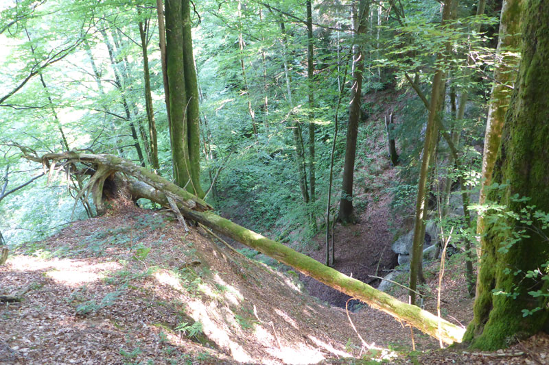 Nach Hochreute bekomme ich wieder Asphalt unter die Trailschuhe. Auf einer Teerstraße geht es nämlich immer abwärts am Alpsee entlang bis zum Trieblinger Weg, wo wir uns von den Kurzstrecklern verabschieden. Der Streckenposten schickt mich nach rechts weg und warnt mich, dass ich gleich durch eine Unterführung laufen muss. Das könnte eng werden, meinte er. Tatsächlich muss ich etwas den Kopf einziehen, um unverletzt auf der anderen Seite wieder herauszukommen.