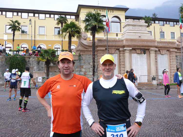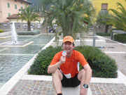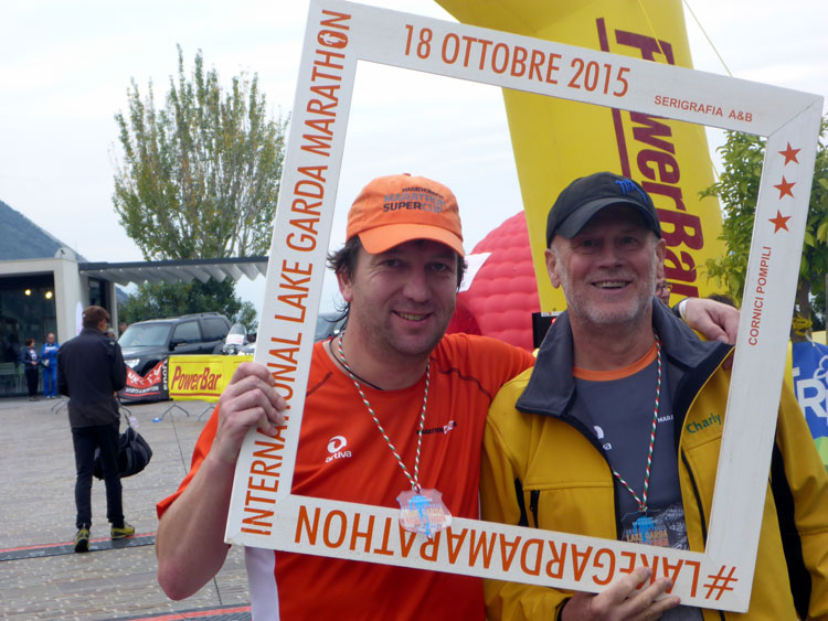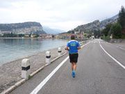 In Torbole überquere ich eine Brücke und finde mich nun am Strand von Torbole wieder. Nur noch einen Kilometer und ich habe das Ziel erreicht. Ich lasse es nochmal richtig krachen und habe teilweise Probleme, den engen Kurven der Strandpromenade zu folgen. Zudem haben sich etliche Touristen unterwegs, die zu umlaufen sind. Egal, nur hier und da noch eine Kurve und ich habe den gelben Zielbogen vor mir. Ich warte noch auf ein paar Mitläufer, die ich unterwegs kennengelernt, aber auf den letzten Kilometern hinter mir gelassen habe und empfange sie im Ziel. Charly ist natürlich auch schon da und berichtet mir von seinen Erlebnissen, die sich mit meinen decken. Wir sind begeistert. Eine wirklich tolle Strecke. Im Getümmel entdecke ich auch noch Stefano Chelodi, den Verantwortlichen des Lake Garda Marathon, und lobe Organisation und Strecke, was ihn sichtlich freut. Die Siegerehrungen sind bereits im Gange und ich nütze die Zeit, um mich umzuziehen.