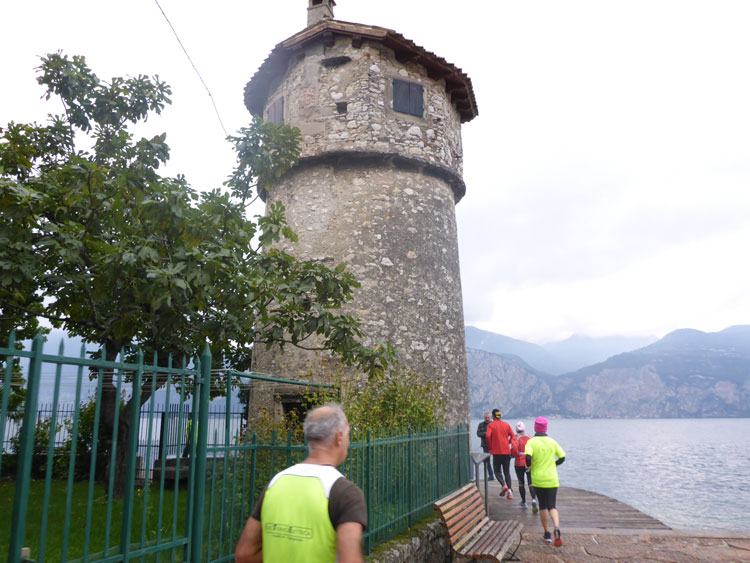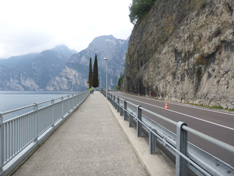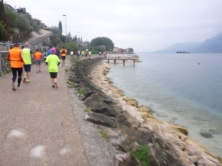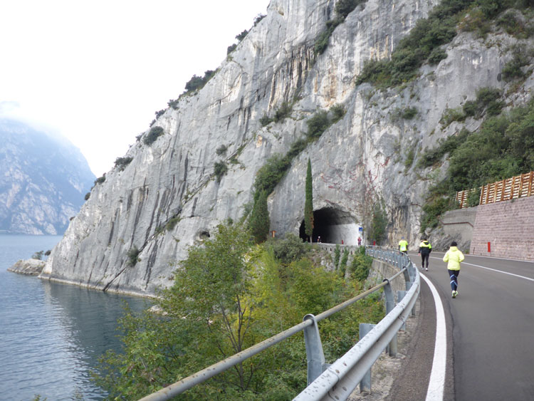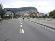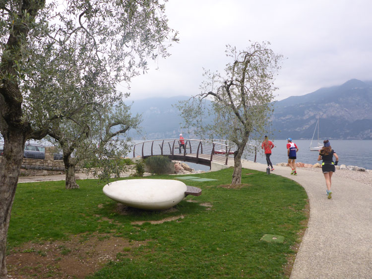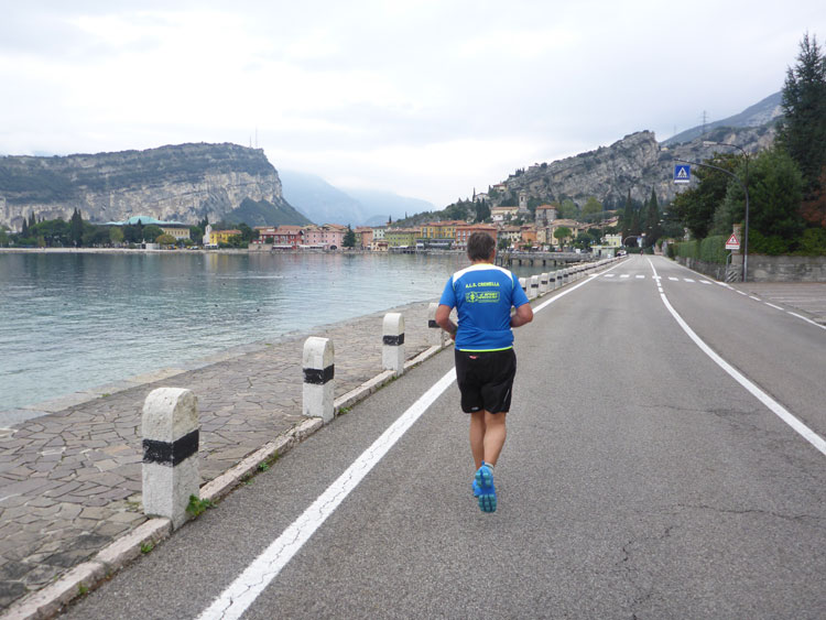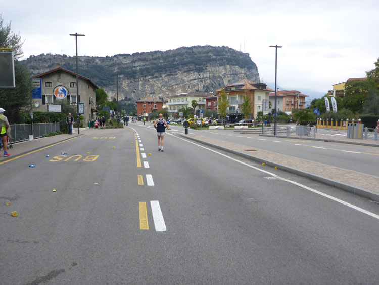 Ich nehme den Weg nach rechts, der die Marathonis auf eine zwölf Kilometer lange Schleife rund um Torbole schickt. Über die Via Giacomo Matteotti, Torboles Hauptstraße, verlassen wir den Hauptort schnell wieder und überqueren den Fiume Sarca, einen von drei Quellflüssen des Mincio, der kurz darauf in den Gardasee mündet. Die Viale Rovereto führt uns weiter am Ufer des Gardasees entlang in Richtung Nordosten bis zu einem weiteren Wendepunkt.