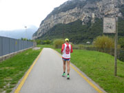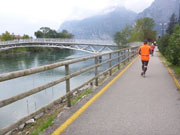 Ein paar Marathonis haben diese Schleife bereits hinter sich und kommen mir entgegen. Später, als ich mich auf dem Rückweg befinde, stelle ich zufrieden fest, dass immer noch einige Teilnehmer die Schleife vor sich haben. Wir laufen in Richtung Norden. Die Strecke ist hier weniger attraktiv, lediglich die Bergmassive, die uns umgeben, sind ziemlich eindrucksvoll. In einem kleinen Industriegebiet dürfen wir endlich wenden und werden auf einen Wanderweg geschickt, der entlang des Fiume Sarca in Richtung Torbole führt. Ab jetzt kann ich den Lauf wieder richtig genießen. Die Landschaft ist herrlich und die restliche Distanz überschaubar.
