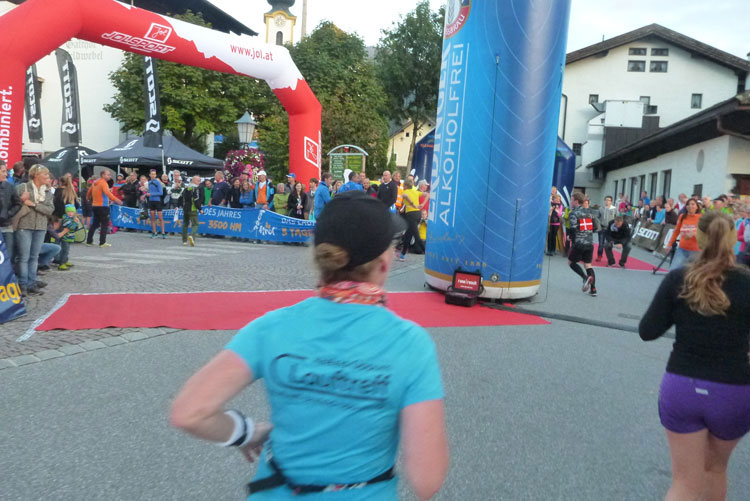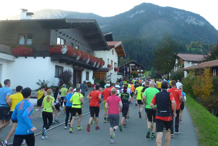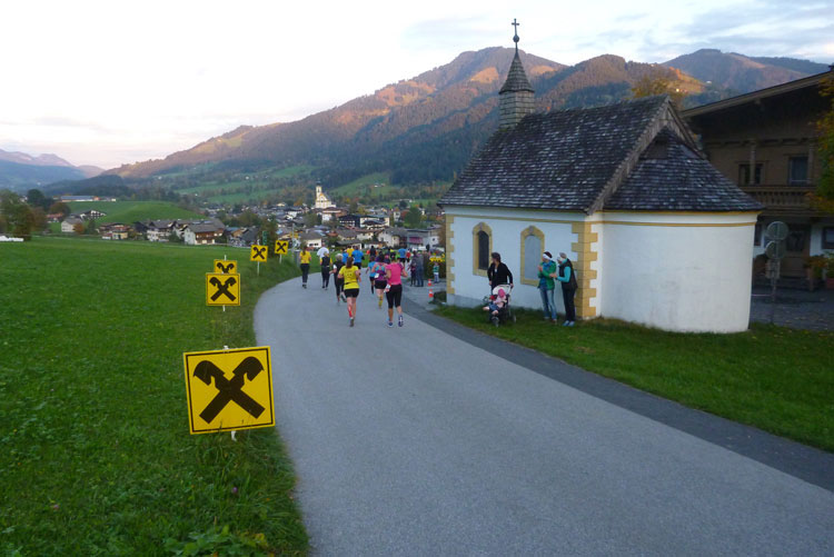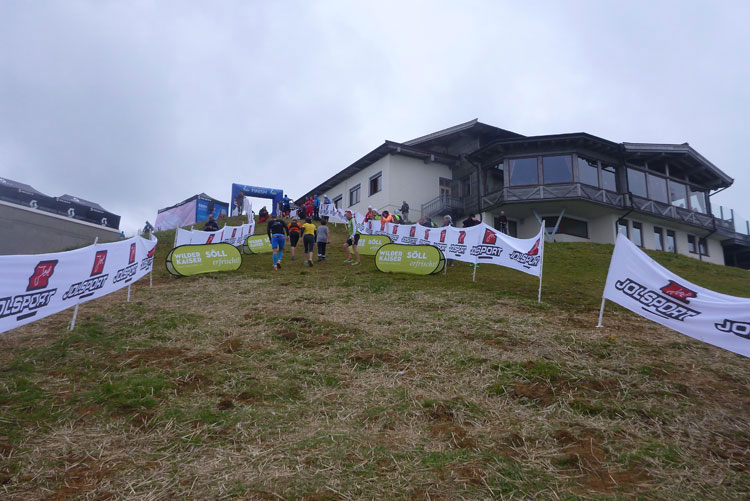 Mit kleiner Verspätung schickt uns ein Böllerschuss auf die Tour. Die Einführungsschleife führt auf altbekannten Weg über das Alpenschlössl wieder zurück nach Söll. Die Schleife ist genau 7,7 km lang bis zum gestrigen Zieleinlauf in der Ortsmitte. Die Runde beinhaltet bereits einige Höhenmeter, aber keine sonderlichen Schwierigkeiten und bietet sich daher wunderbar an, um die Maschinerie ins Rollen zu bringen. Etwas eng ist die Vorgabe: 50 Minuten gibt man uns Zeit, das Tor zu passieren. 500 Meter vor dem Durchlauf, wir sind knapp dran, fragt mich eine Mitstreiterin: „Ob die das wirklich einhalten wollen?“. Ich finde auch, das ist durchaus ambitioniert und ich kann mir nicht vorstellen, dass alle in der Zeit hier durchkommen werden. Wie’s dann letztendlich vom Veranstalter gehandhabt wird, bleibt abzuwarten.