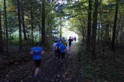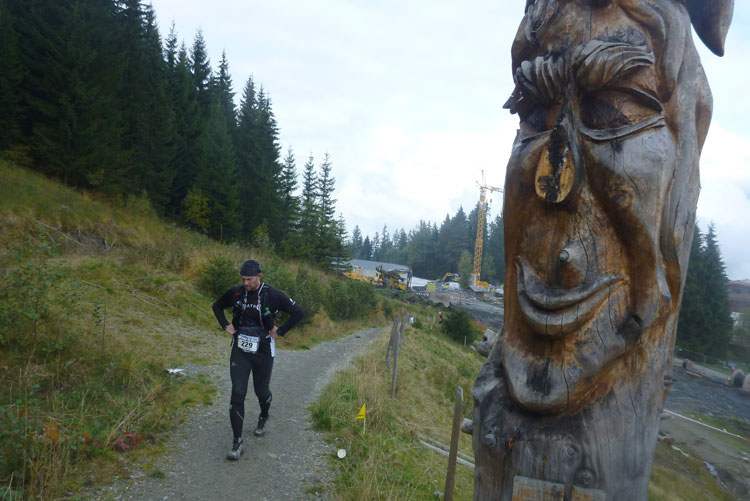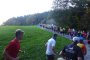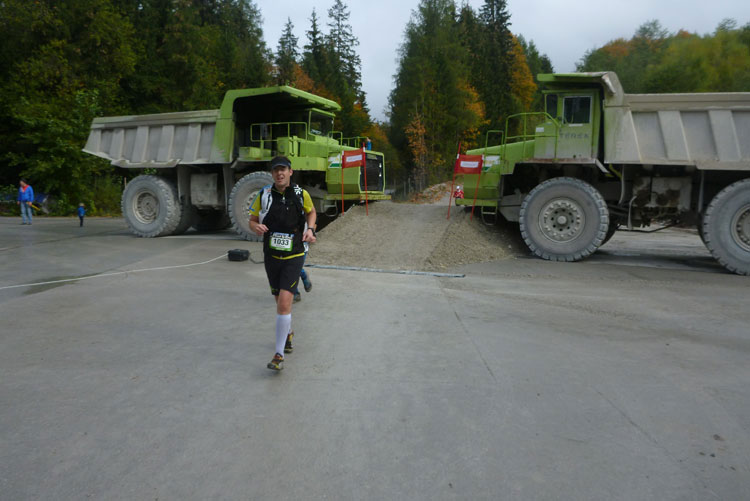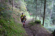 Auf meist breiten Forstwegen geht es nach oben. Ich muss immer wieder kurze Abschnitte laufen, die man in meiner Leistungsklasse sonst eigentlich nur marschierend bewältigt. Das kostet viel Kraft. Etwas unterhalb der Rübezahlalm ist mitten im Wald die Zeitmesskontrolle aufgebaut. Für die 19,5 km und bestimmt 800 Höhenmeter sind 2:30 vorgesehen, ich bin um 5 Minuten drüber …aber, der Zeitnehmer ist ganz unaufgeregt, es wird jetzt auch noch niemand aus dem Rennen genommen. Man hat schnell reagiert und wohl eingesehen, dass man sich verkalkuliert hat und diese Vorgabe von vielen nicht einzuhalten ist.