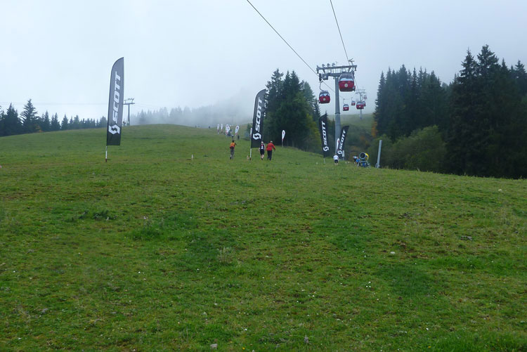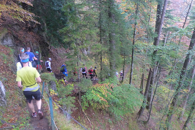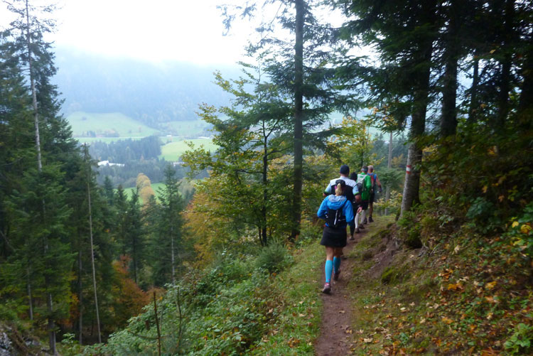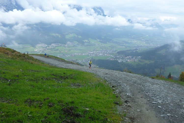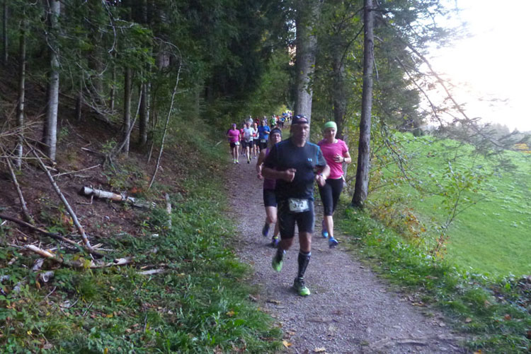 Eine weitere Streckenänderung führt uns jetzt um den See herum und auf schmale Bergpfade, entfallen ist dafür eine lange Bergabpassage auf einer Schotterstraße. Das sind 3 km zusätzliche Trails, verkürzt zwar nicht unsere Laufzeit, erhöht aber den Spaßfaktor gleich gewaltig. Am Aualmlift geht’s runter – ich kenn den wirklich ohne zu recherchieren, hier gibt’s tolle Skiabfahrten – 3 km Downhill sind angesagt.