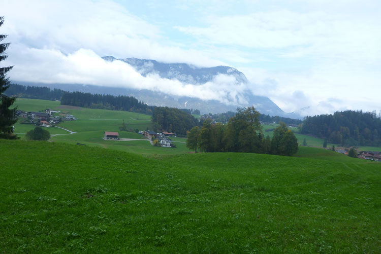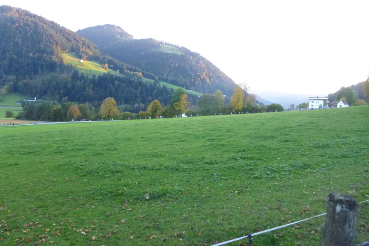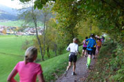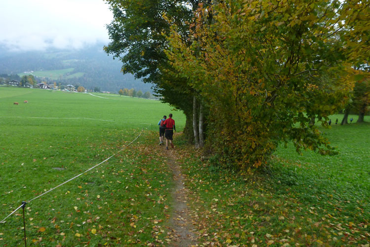 Nach einer Getränkestation geht es am Ortsende von Söll rechts ab und wir kommen auf den neuen Streckenabschnitt bis zur Rübezahlalm. Kurz vorher gibt es dort bei km 19,5 mit 2:30 Stunden eine weitere Sollzeit einzuhalten. Für mich hört sich das durchaus wieder anspruchsvoll an. Am Ortsende dürfen wir auch schon die erste kleine Steigung erklimmen. Schön gefällig mit einem steten, leichten Auf und Ab, abwechselnd auf Trails und auf Bergwegen, führt der Kurs in nicht allzu großer Höhe über dem Tal in Richtung Scheffau. Der Abschnitt ist wirklich schön zu laufen, noch nicht gespickt mit Höchstschwierigkeiten, kostet aber trotzdem wesentlich mehr Zeit als früher.