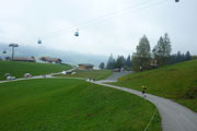 Auf schmalen Almwegen und Single-Trails geht es wellig durch das Skigebiet bis zur Tanzbodenalm. Die Strecke führt mitten durch das Bergrestaurant, wo wir von einem Sprecher angekündigt werden. Die Leute geizen nicht mit Applaus, als ich meine Kamera zücke.