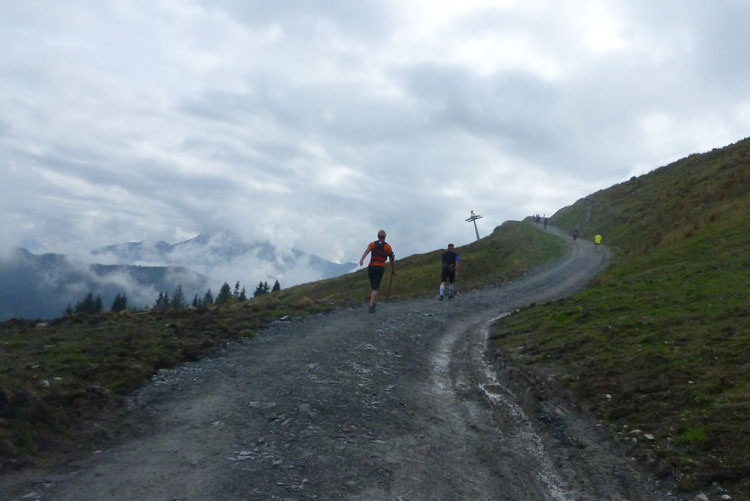 Etwas oberhalb der Bergbahnen von Scheffau (km 15) führt uns eine toller Serpentinentrail durch den Wald wieder bis fast hinunter ins Tal. Ab hier beginnt dann der richtige Aufstieg. 1000 Höhenmeter sind auf den nachfolgenden 10 Kilometern zu vernichten. Wie sieht’s mit meiner Zeit aus? Oh oh, bis zum Zeitlimit bleiben mir noch 45 Minuten für 4,5 km im permanenten Anstieg. Das wird eng werden.