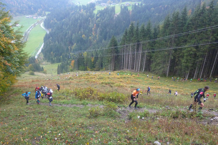 Nichts Neues gibt es am Anfang des Gipfelsturms. Wie gehabt geht es über die Schwarze Abfahrt fast senkrecht nach oben. Die Steigung weist über 30 % auf. Andrea aus Berlin macht heute ihren ersten Bergmarathon, ein paar blutige Kampfspuren hat sie sich dabei schon eingehandelt. Das muss ich natürlich mit einer Nahaufnahme bildlich festhalten. Nach zwei Kilometern zweigen wir nach links ab und umrunden die Hohe Salve unterhalb des Gipfels fast komplett im Uhrzeigersinn. Anfangs ist sogar ein Abschnitt mit leichtem Gefälle dabei.