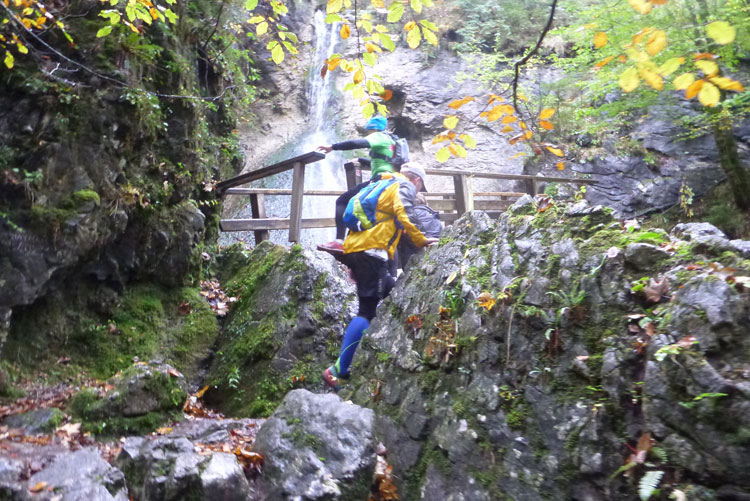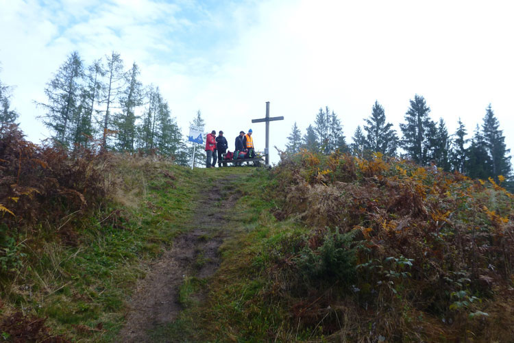 Auf dem Rübezahlwanderweg geht es hinauf zur Bergstation der Hartkaiserbahn. Auf dem knapp drei Kilometer langen Abschnitt können wir die vom Wirt der Rübezahlhütte mit der Motorsäge erschaffenen Holzfiguren bewundern. Kräftezehrend zieht sich der Wanderweg immer gleichmäßig steil nach oben. Leider verhindern die Wolken heute die großartige Aussicht auf den Wilden Kaiser, ansonsten sind die Bedingungen eigentlich nicht schlecht. Vielleicht 2-3 Grad zu kühl hier oben.