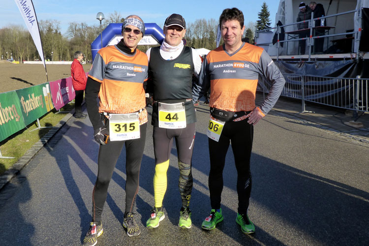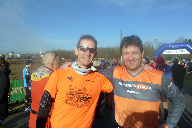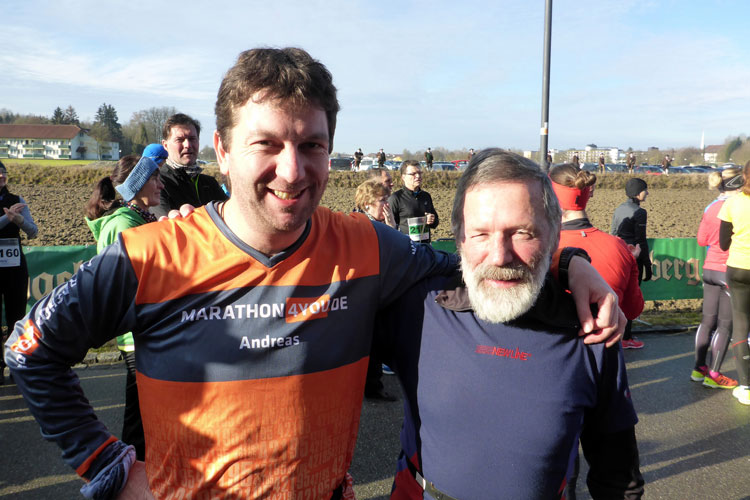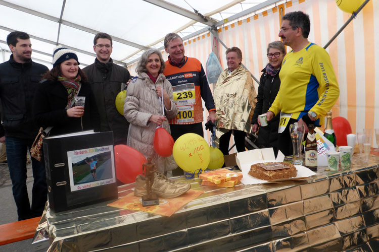 Bevor ich aber im Kreisverkehr wieder links abbog, gönnte ich mir wieder einen Becher Tee. Auf ein weiteres Energy-Gel musste ich verzichten. Die waren bereits vergriffen. Naja, es hat wohl auch Nachteile, wenn man etwas gemütlicher unterwegs ist. Aber ich war mir sicher, dass ich den Lauf auch ohne Gel gut ins Ziel bringe und so trabte ich gemütlich weiter. Ähnlich wie bei der dritten Runde ignorierte ich wieder die Kilometerangaben für den Marathon und konzentrierte mich nun auf die blauen Tafeln des 10-Kilometerlaufs. Zur weiteren Motivation suchte ich immer einen Läufer vor mir und versuchte, meist mit Erfolg, auf diesen aufzulaufen. So verflogen die letzten Kilometer geradezu und ich konnte noch einige Läufer überholen. Auf den letzten Kilometern konnte ich mein Tempo sogar noch auf 5:30 Minuten pro Kilometer steigern. Nun konnte ich auch noch ein marathon4you-Shirt rund 100 Meter vor mir erkennen. Es war Herbert Orlinger, der kurz davor war seinen hundertsten Marathon ins Ziel zu bringen und so konnte ich ihm nach dem Überqueren der Ziellinie auch tatsächlich als einer der ersten gratulieren. Im Verpflegungszelt schnappte ich mir eine Wärmedecke und eine O-Saftschorle und schnaufte erst mal kurz durch. Herbert war derweil schon am Feiern. Ein Tisch mit Kuchen, Sekt und einem eigens gefertigten Pokal, sowie zahlreiche Gratulanten sorgten im Zelt für Stimmung.
