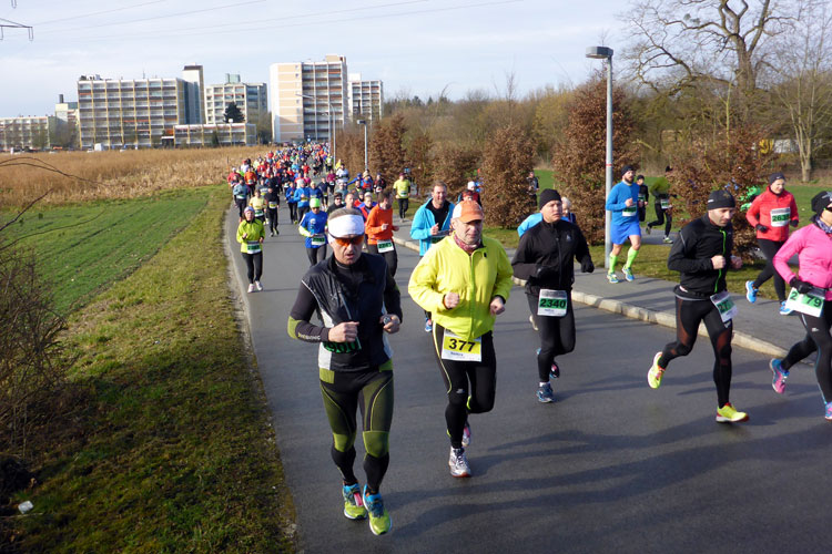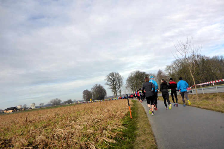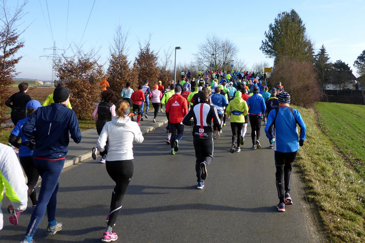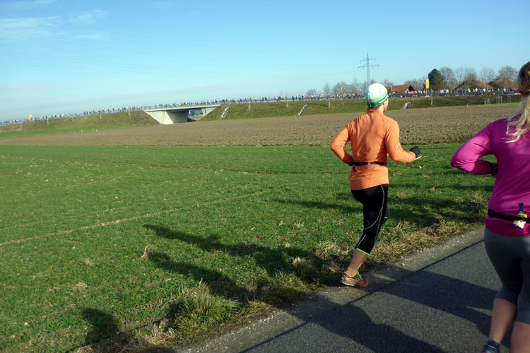 Also los geht’s und wir biegen gleich nach den Thermen im Kreisverkehr rechts ab. Ich versuche erst mal mein Tempo zu finden, was gar nicht so einfach ist, wenn man sich erstens schon mal zu weit vorne eingereiht hat und zudem noch von zahlreichen Halbmarathonlern umgeben ist. Doch nach drei Kilometern stimmt auch die Angabe auf meiner Garmin und ich habe mich so um die 6:20 Minuten pro Kilometer eingependelt. Nach fünf Kilometern entlang einer Staatsstraße kommt die erste Verpflegungsstation, die wieder einmal perfekt ausgestattet ist. Ich greife mir einen warmen Tee und freue mich, dass die erste Runde schon zur Hälfte geschafft ist. Doch irgendwie fühlen sich meine Beine heute schwer an und ich weiß nicht, wie ich die ganze Strecke vernünftig schaffen soll. Ich versuche das Gefühl zu ignorieren und laufe weiter.