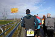 Kurz danach überquere ich zum zweiten Mal die Zeitmatte im Zielbereich. Natürlich auf der linken Seite, es geht ja noch weiter. An der Verpflegungsstelle nehme ich mir noch ein Energy-Gel und spüle es zusammen mit dem immer noch warmen Tee runter. Jetzt geht es nach dem Kreisverkehr wieder rechts raus und zum zweiten Mal begebe ich mich auf die 11-Kilometer-Runde. Nun wird es sehr ruhig auf der Strecke, haben sich die 400 Starter offensichtlich gut verteilt. Aber irgendein Mitläufer ist eigentlich immer in Sichtweite, so dass man nicht ganz alleine unterwegs ist. Ich weiß, dass nun der schwierigste Teil des Laufes kommt. Üblicherweise habe ich zwischen 25 und 30 Kilometer immer ein kleines Motivationsloch, das es zu überwinden gilt. Heute habe ich eine neue Taktik. Ich beginne im Kopf meinen Lauf neu, ich laufe jetzt quasi einen Halbmarathon und so sind es nach der Kilometertafel vier nur noch 17 Kilometer bis zum Ziel. Klingt jetzt vielleicht komisch, aber mir hat`s geholfen. Die Kilometertafel mit den angegebenen 25 Kilometern habe ich einfach ignoriert. So verlief auch die dritte Runde ganz gut, so dass ich immer noch im 6:20`er Schnitt unterwegs war und bald wieder die Ziellinie vor Augen hatte. Nun wurde ich auch wieder von schnelleren Marathonis überholt, die bereits am Ende der vierten und letzten Runde waren. Sie kamen mit einer Zeit von etwa 3:15 Stunden in Ziel. Ich ließ mich aber nicht beirren und freute mich darauf, dass ich die schöne 10-Kilometer-Runde noch vor mir habe.