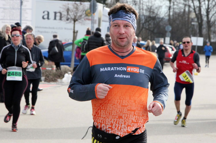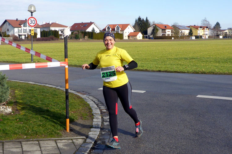 Der zweite Teil der ersten Runde gefällt mir wesentlich besser. Nach einer kurzen Pendelstrecke geht es rein in den Altort von Bad Füssing, wo sich auch wieder ein paar Zuschauer eingefunden haben und so naht schon bald das Ende der ersten Runde. Ich liege voll im Zeitplan und endlich stellt sich auf ein Gefühl von Zuversicht ein. Die Beine sind nun lockerer und auch sonst fühle ich mich gut. Ich genieße die Sonnenstrahlen und nähere mich wieder den Thermen. Etwa einen halben Kilometer vor Überquerung der Startlinie staune ich nicht schlecht. Mich überholt ein Fahrradfahrer, dem ein Läufer mit einem Affenzahn folgt. Es ist Tobias Schreindl von der LG Passau, der sich auf den letzten Metern seines Halbmarathons befindet. Diesen gewinnt er vor meinen Augen in einer fantastischen Zeit von 1:08:13 Stunden. Wahnsinn. Da hat der Kerl doch glatt zehn Kilometer Vorsprung auf mich rausgelaufen. Aber gut, ich will ja auch doppelt so weit laufen wie er und reihe mich deshalb kurz vor dem Zielbogen auf der linken Spur ein, um die zweite Runde in Angriff zu nehmen. Doch zuvor greife ich mir wieder einen Becher warmen Tee und biege kurz danach im Kreisverkehr nach links ab.