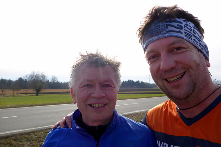 Die zweite und kürzere Runde ist mit der ursprünglichen Strecke größtenteils identisch und ich freue mich darauf. Wir laufen zunächst wieder durch den Altort, bevor es raus geht ins Hinterland, wo man die Ruhe und das tolle Wetter so richtig genießen kann. Ich kann mein Tempo weiterlaufen, ohne dass ich dabei große Mühen habe und das motiviert mich. Bei etwa 18 Kilometer sehe ich vor mir eine vertraute Gestalt und muss kurz für ein gemeinsames Selfie bremsen. Ludwig Schürger, Veranstalter des Dreiburgenland Marathons, bei dem ich in diesem Jahr zum dritten Mal an den Start gehe, hat sich für den Halben entschieden und scheint mich sich zufrieden zu sein. Wir wechseln kurz ein paar Worte und verabreden uns für Thurmansbang in zwei Monaten. Kurz danach biege ich wieder ab und es geht zurück in Richtung Bad Füssing. Auf den letzten beiden Kilometern werde ich unbeabsichtigt schneller. Die Halbmarathonis um mich herum setzten zum Endspurt an und ich muss mich zügeln, um das Tempo nicht mitzulaufen.