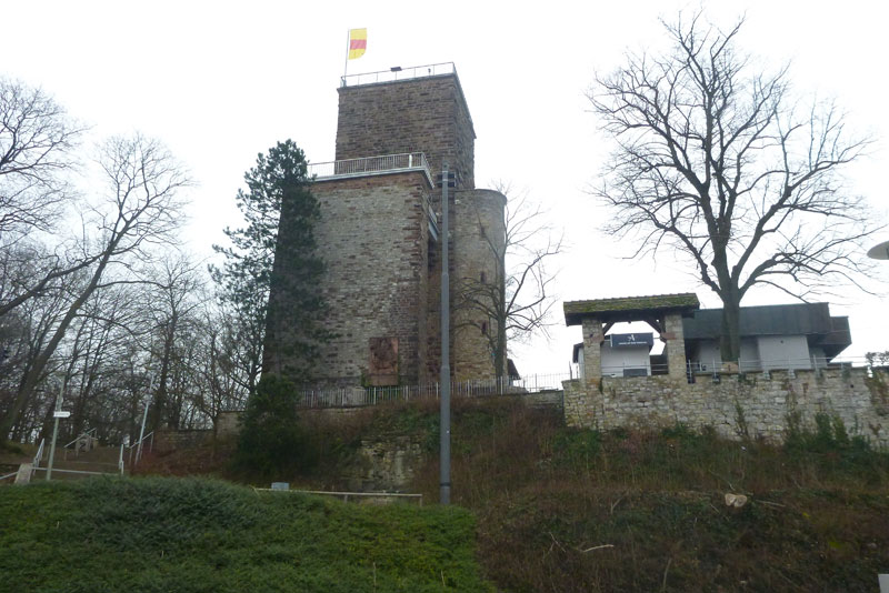 Seinen Namen hat der Turmberg von einem alten Turmbau aus der späten Stauferzeit. Die Pfinzgaugrafen hatten hier im 11. und 12. Jahrhundert ihren Sitz und übten im Auftrag der Salierkönige Herrschaftsrechte aus. Der heutige, 28 Meter hohe Turm ist geprägt durch die für die Stauferzeit typischen robust und wehrhaft wirkenden Buckelquader.