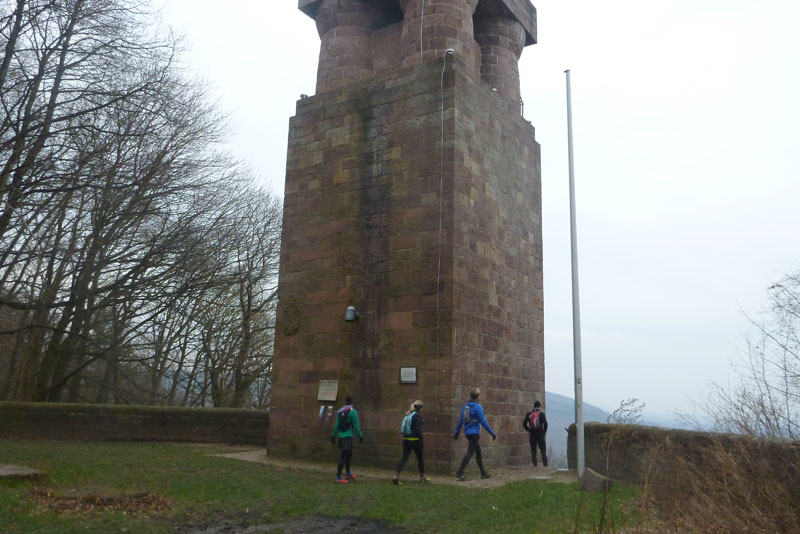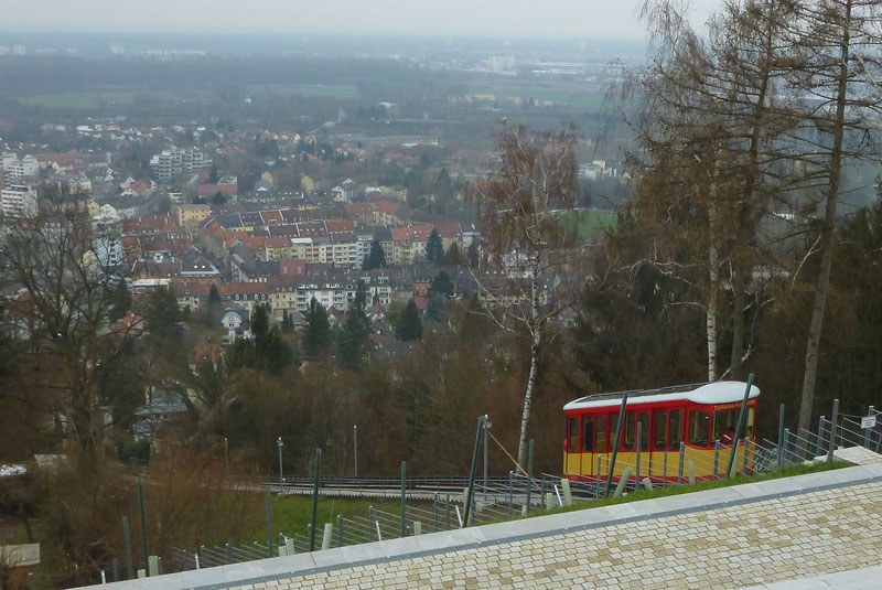 Für die Karlsruher ist er ein beliebtes Ausflugziel, mit der Turmbergbahn kann man seit 1888 den Berg hochfahren, sie ist damit die älteste noch im Betrieb befindliche Standseilbahn Deutschlands. Man kann aber noch bequemer, so wie wir, mit dem Auto hochfahren. Von oben bietet sich ein toller Blick auf die Rheinebene und das Stadtgebiet von Karlsruhe, leider ist es heute bewölkt, so sind wir in der Aussicht etwas begrenzt.