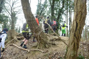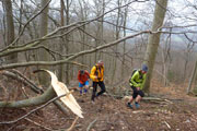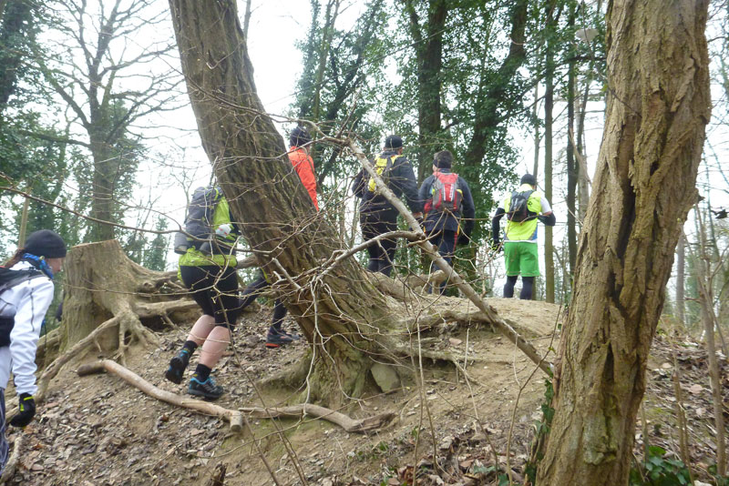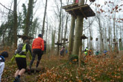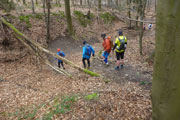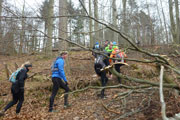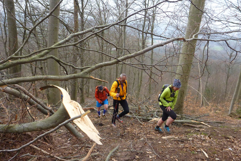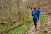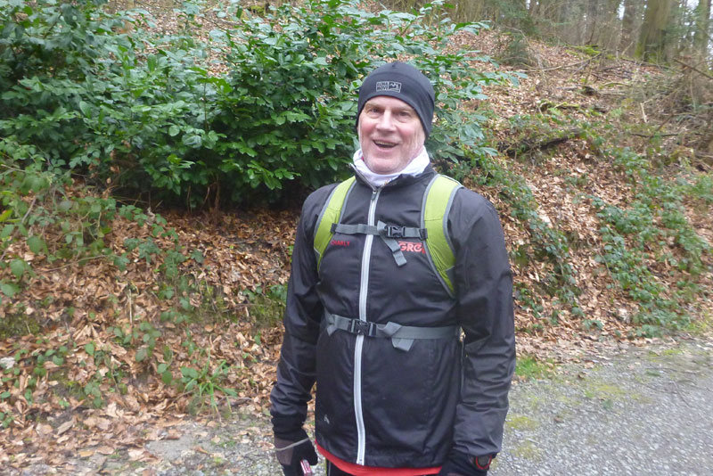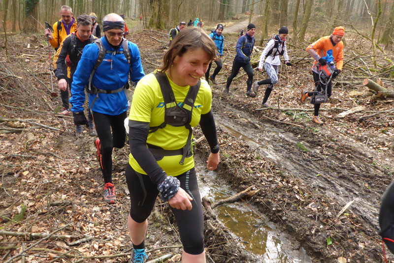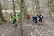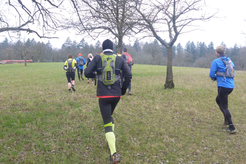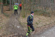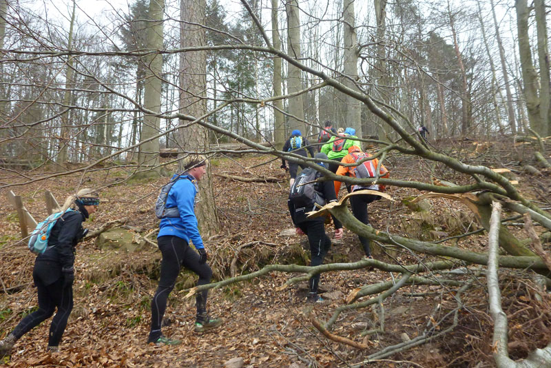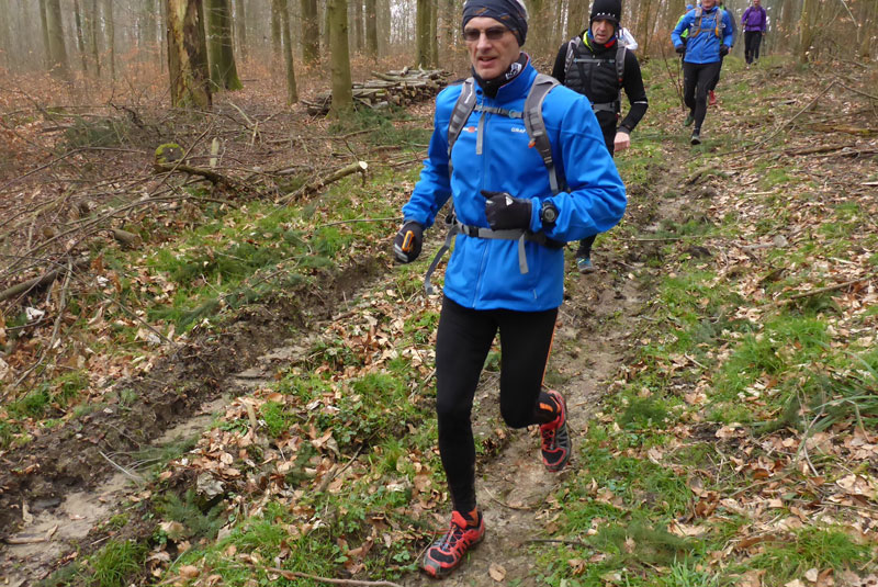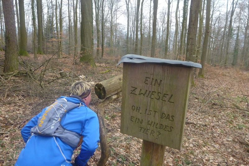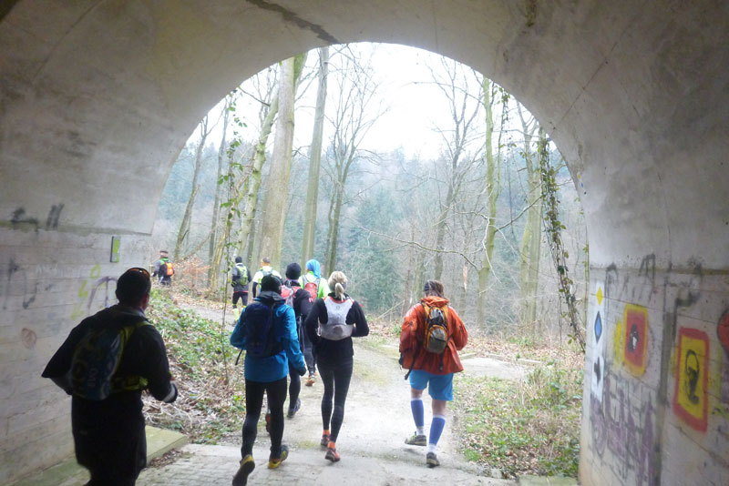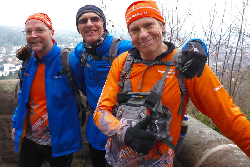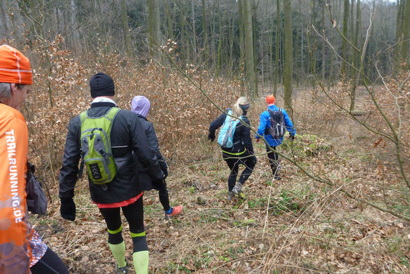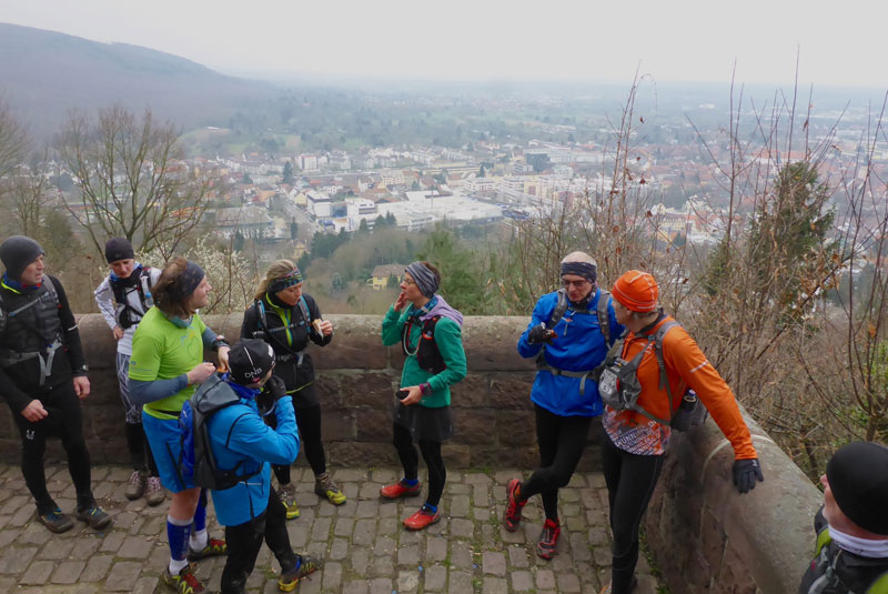 Um 10:30 Uhr geht’s los, zuerst mit einer kurzen Ansprache von „Gü“ und einem Gruppenfoto mit Panoramablick auf Karlsruhe. Aber dann geht’s auch schon auf die Trails Richtung Westen. Nach etwa 10 Kilometern erreichen wir die A8, ein paar Meter laufen wir etwas oberhalb, parallel zur Autobahn. Der Lärm ist unglaublich, obwohl noch nicht einmal sonderlich viel Verkehr herrscht. Ein Tunnel führt uns auf die andere Seite der Fahrspuren noch tiefer in den Schwarzwald. Gü hat sich viel Mühe gegeben und präsentiert uns fast ausschließlich Trails und Naturwege.