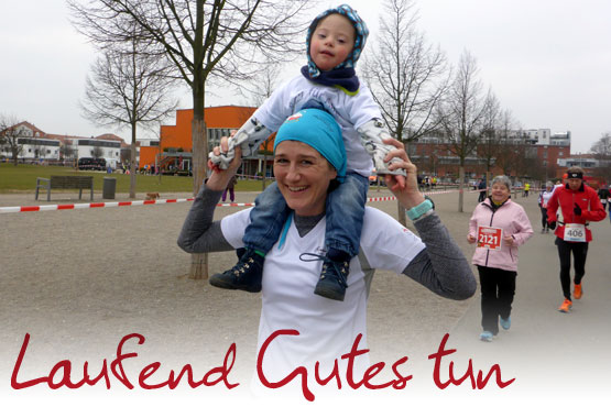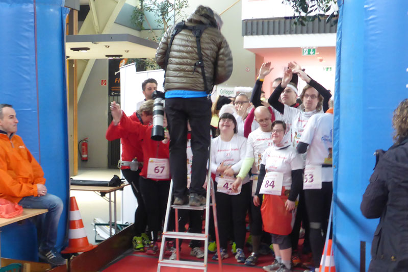 Auf der Leinwand kurz nach dem Startbogen kann ich nun auch meinen Namen entdecken. Der Leih-Chip funktioniert also. Mehr Information kann ich in der kurzen Zeit aber nicht ablesen, denn hinter mir laufen dichtgedrängt weitere Läufer über die Zeitmatte, so dass mein Name schnell wieder aus der Anzeige verschwindet. Ich drehe weiter meine Runden und freue mich über die zahlreichen Teilnehmer mit Down-Syndrom, die erkennbar ihre Freude am Laufen haben. Da wird laut gelacht, gesungen und auf Höhe des DJ's, dessen Musik in der vierten Runde dann doch erfreulicherweise auf Rock aus den 80er Jahren umschwenkt, schon mal getanzt. So vergeht die erste Stunde erfreulich schnell und ich kann auch schon mal das Büffet ausprobieren. Warmer Tee, Hanuta und Nutellabrot habe ich ziemlich schnell zu meinen Favoriten auserkoren. Verhungern und verdursten werde ich also nicht. Nicht nur dass man relativ flexibel mit der Nahrungsaufnahme ist, mir zeigt sich bald noch ein weiter Vorteil des Rundendrehens. Meine Sporttasche hatte ich vor dem Start auf einer Parkbank direkt an der Strecke abgelegt und ich kann mich problemlos meiner Handschuhe entledigen, da es mir inzwischen doch warm geworden ist. Für den Fall der Fälle habe ich dort auch noch Wechselklamotten deponiert.