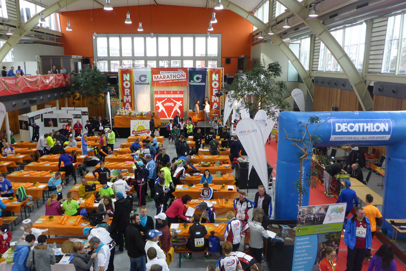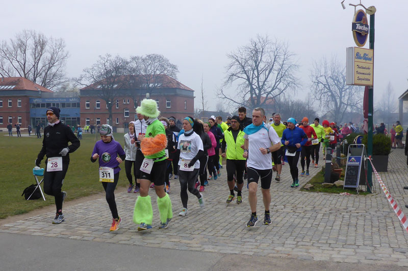 Auf der zweiten Runde blieb mir nun also Zeit, um mich in aller Ruhe mit der Strecke selbst zu beschäftigen. Kurz nach dem Startbogen geht es also raus aus der Halle und danach gleich links. Teer und Kopfsteinpflaster wechseln sich ab. Nach vielleicht fünfzig Metern biegen wir im rechten Winkel nach rechts ab. An der Ecke stehen zwei Damen, die nicht nur darauf achten, dass niemand abkürzt, sondern sie applaudieren lautstark, indem sie zwei „Plastikwürste“ gegeneinanderschlagen …wie lange werden sie das wohl aushalten? Nun geht es geschätzte zweihundert Meter geradeaus, bevor es wieder im rechten Winkel nach rechts geht und dann kommt eine lange Gerade, wobei auf halber Strecke DJ Firewall an seinem Mischpult alles gibt um uns anzuspornen. Die Musik ist furchtbar und ich hoffe, dass er noch etwas anderes im Repertoire hat. Bald geht es natürlich wieder im rechten Winkel rechts weg und ich sehe Jörg Kaltwasser, der am linken Streckenrand Connys persönliche Verpflegungsstation aufgebaut hat. Da werde ich mir sicher das ein oder andere Mal auch was stibitzen.