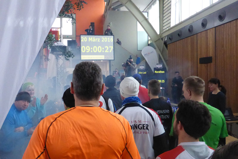 1,3 Kilometer in nicht mal mehr zehn Minuten. Klar, das ist eigentlich kein Problem, aber irgendwie war mir nicht wohl und so legte ich einen ordentlichen Zahn zu. Die letzte Runde bewältigte ich in meinem üblichen Halbmarathon-Tempo, was schon ordentlich an die Substanz ging. Kurz bevor ich wieder aus der Halle herauslief, die Erleichterung: 38 Runden und 50 Kilometer waren auf der Anzeigetafel zu lesen. Nachdem ich wieder aus der Halle heraus war, wollte ich wieder Tempo rausnehmen, da ich schon wirklich am Anschlag war. Das nahm mir mein Magen übel … mehr will ich zu diesem Thema nicht verlieren. Aber nach einer kurzen Unterbrechung lief ich weiter, noch ein paar hundert Meter als Zugabe. Kurz bevor ich ein letztes Mal DJ Firewall passierte, beendete er abrupt sein Musikprogramm und eine seltsame Stille kehrte ein. Ich schaute auf meine Uhr. Auch wenn die Kilometerangabe nicht stimmte, die 5:59 gelaufenen Stunden zeigten an, dass die letzte Minute lief. Die Streckenposten bewaffneten sich mit Luftdruck-Fanfaren und warteten auf das Signal, das uns vom Rundendrehen erlösen sollte.