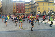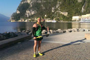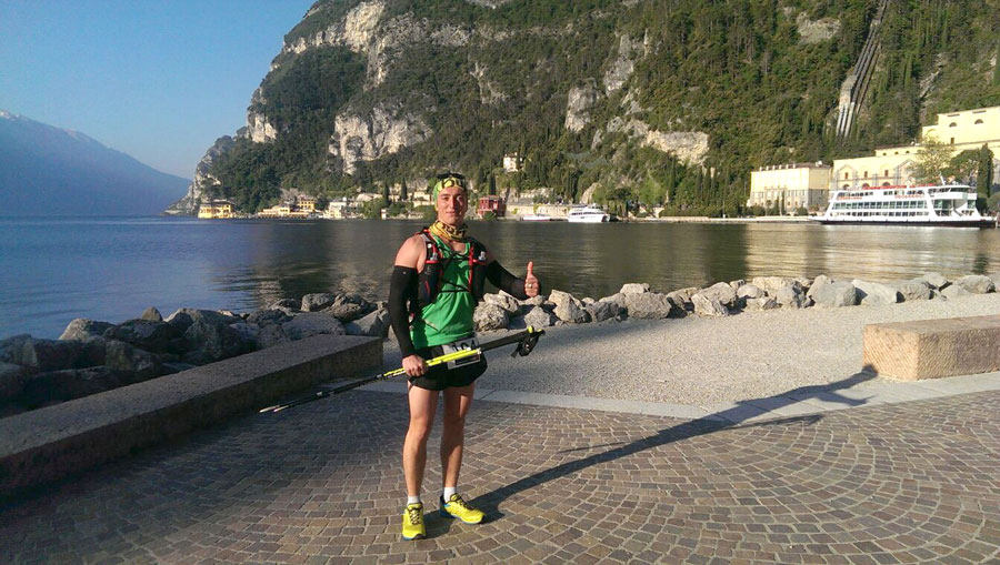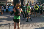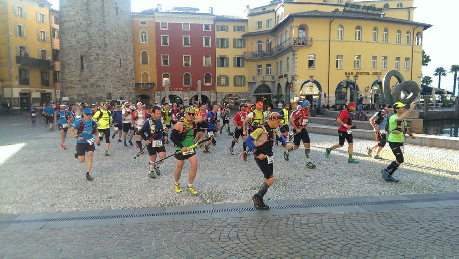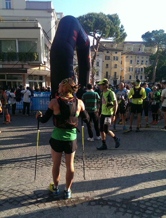 Mit einer Mischung aus Frust und Erleichterung begab ich mich zurück zu Auto und wir fuhren wieder nach Riva. Der Rest bis zum Start verlief dann recht reibungslos, noch schnell drei, vier Bananen rein und ich befand mich endlich im anfangs geschilderten Startbereich mit ca. 350 Mitläufern, von denen der Großteil aus Italien, bzw. der näheren Umgebung zu kommen schien, da gefühlt jeder den anderen kannte. Ein wenig irritiert war ich ob der Ausrüstung des Großteils meiner Mitstreiter. Wie so mancher die vorgeschriebenen Ausrüstungsgenestände wie Windjacke, Erste-Hilfe-Decke, Stirnlampe mit Ersatzbatterien, Ein-Liter-Trinkgefäß in seine doch recht überschaubare Bauchtasche bekommen hat, bleibt sein Geheimnis. Ich kam mir im Vergleich mit meinem Salomon Zwölf-Liter-Rucksack eher wie ein Packesel vor. Naja sind halt Verpackungskünstler die Italiener. Ach ja, kontrolliert wurde natürlich nicht.