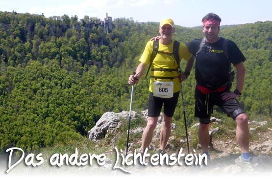 Die Strecke ist super markiert, auch wenn ich mal kurz alleine bin, gibt es nie Zweifel wohin der Weg führt. An dieser Stelle sei Denis für seine Organisation auch mal gelobt. Charly, Bernie und ich laufen zusammen, wobei mir klar ist, dass ich das schwächste Glied in unserem Team bin und hoffe inständig, dass die beiden heute nicht doch noch der Ehrgeiz packt. So alle drei bis vier Kilometer greife ich zu meiner Getränkeflache und nehme einen tiefen Schluck. Das Trinken ist heute wichtig, es wird warm. Zur Grundausstattung jedes Läufers gehören übrigens mindestens ein Liter Flüssigkeit – ich habe zwei Liter dabei, ein Handy und eine – überflüssige – Regenjacke. Wir befinden uns, wenn ich es auf dem Begleitzettel richtig entziffern kann, nun im Naturschutzgebiet Wönhalde-Spielberg. Immer wieder haben wir einen tollen Blick in Tal. Lichtenstein liegt nun schon weit unter uns. Wir haben schon ein ordentliches Stück und viele Höhenmeter in den Beinen. Irgendwann bei Kilometer fünf oder sechs lasse ich Bernie und Charly ziehen, sie sind mir einen kleinen Ticken zu schnell. Die Oberschenkel machen sich schon deutlich bemerkbar.
