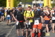 Als Finisher-Geschenk konnten wir noch ein passendes Finisher-Shirt aussuchen. Ein kaltes Spezi gegriffen und ab in den Schatten. Ich war platt. Schon nach ein paar Minuten waren Charly und ich allerdings gut erholt und trafen wenig später – frisch geduscht – auf Kathrin und Sven. Die beiden hatten den Halbmarathon ebenfalls gut überstanden und waren von der Strecke begeistert. Gemeinsam stärkten wir uns noch im Biergarten vor dem Sportheim bei mittelmäßiger Kost, hatten jedoch den Zielhang stets im Blick. Knapp dreieinhalb Stunden nach unserem Zieleinlauf war es dann soweit, Bernie bog um die Ecke und konnte Sekunden später finishen. Auch er war völlig platt, hatte aber den Respekt von Charly und mir sicher … wir waren uns einig, den Marathon hätten wir heute nicht ins Ziel gebracht.