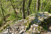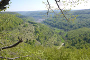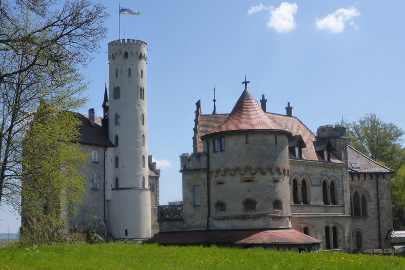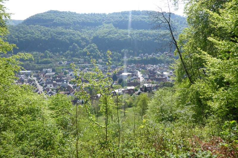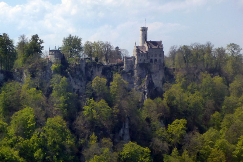Erst mal durften wir uns im Wald nun wieder nach unten treiben lassen. Das tat gut und war erholsam. Allerding war die Strecke mit Laub und scharfkantigen Steinen bedeckt, so dass das Laufen nicht immer einfach war. Konzentration war gefragt. Ich merkte schon bald, dass sich an meinen Zehen, die eine oder andere Blase bildete. Vor allem der große Zeh am rechten Fuß schien seinen Umfang verdoppelt zu haben. Nachdem wir im Tal eine Bundesstraße überquert hatten, tauchten wir auf der anderen Straßenseite erneut in den Wald ein und schon kam der nächste lange Anstieg. Wir kamen nur noch zäh voran und jeder Schritt brannte in den Oberschenkeln. Doch oben angekommen wurden mir mit einer herrlichen Aussicht belohnt. Das Schloss Lichtenstein lag nun auf der anderen Seite des Tals und führte uns vor Augen, was wir hier bewältigt hatten. Ein Blick auf die Uhr sagte mir, dass es nun nur noch wenige Kilometer bis ins Ziel sind und somit wohl auch keine großen Anstiege mehr vor uns liegen können.