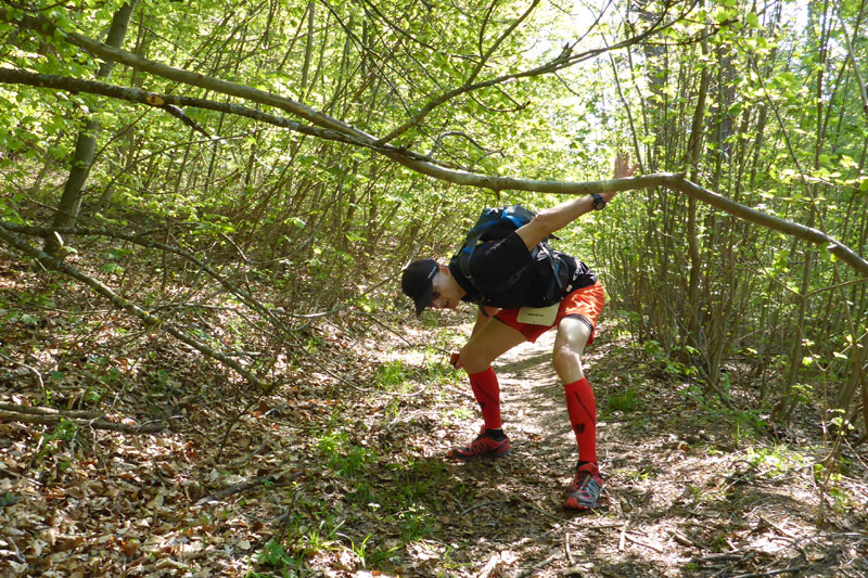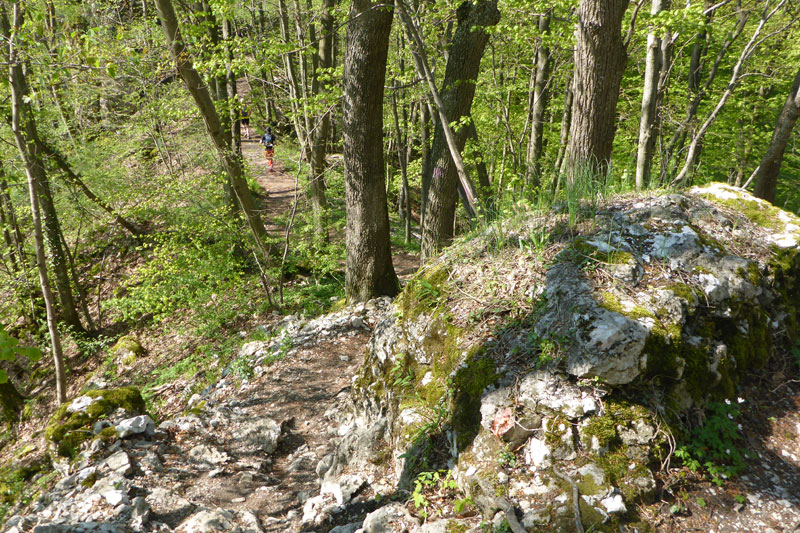 Ich versuche nun meinen eigenen Rhythmus zu finden und habe Spaß an den zahlreichen Bergabläufen, da geht es mir gut. Etwa bei Kilometer 10 geht es in Serpentinen auf einem herrlichen Singletrail bergab. Der macht einfach nur Spaß. Ab und zu muss ich aber in die Botanik springen und die Spitze des Halbmarathons vorbeilassen. Die Jungs haben ein wirklich irres Tempo drauf und es macht Spaß ihnen zuzuschauen. Noch eines findet meinen Gefallen. Diese Superathleten haben immer noch die Zeit, sich bei mir zu bedanken, wenn ich für sie zur Seite gehe. Ausnahmslos bedanken sie sich und geben mir auch mal im Vorbeilaufen einen Klapps auf die Schulter. Unten angekommen, befinden wir uns unweit der Nebelhöhle, einer der schönsten und größten Tropfsteinhöhlen in der Schwäbischen Alb.