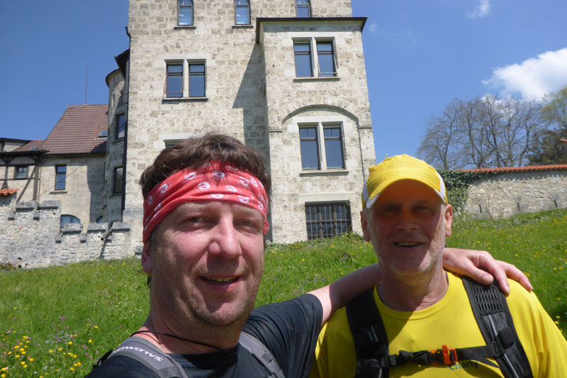 Kurz drauf passiere ich das Schloss Lichtenstein. Ein wirklich nettes Schloss. Sieht irgendwie total hübsch aus, da muss ich mal einen Ausflug machen, denk ich mir noch und ganz unvermittelt steht sie vor mir: Die erste und einzige Verpflegungsstation nach über 14 Kilometern. Ich habe Hunger und will mich auf das Buffet stürzen, als ich zwei vertraute Gestalten entdecke. Charly und Bernie waren auch hier. Ich hätte die beiden schon mehrere Kilometer voraus vermutet, aber hier waren sie beide in Fleisch und Blut. Ich war froh sie zu sehen. Noch bevor ich etwas sagen konnte, erklärte mir Charly, dass er auf den Halbmarathon umsteigen wird. Ich hätte ihn in diesem Moment umarmen können. Bernie kämpfte sich weiter. Einen Ultra zu finishen, dass will er sich natürlich nicht entgehen lassen. Ein kurzer Fotostopp vor dem Schloss und weiter ging`s. Für mich und Charly ging es nun gemeinsam auf den Rückweg. Was war ich froh.