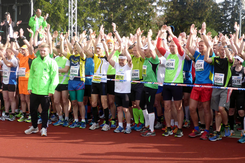 An der GutsMuths-Halle in Neuhaus genehmigen wir uns noch ein kleines Frühstück, geben unsere Klamotten beim DHL-Mann ab und gehen zum Startbereich auf der Sportanlage. Das Wetter ist hervorragend. Das soll beim Rennsteiglauf meistens ja nicht so sein. Doch das ist mir heute erst mal sowas von egal. Ich genieße die Atmosphäre, während sich der Sportplatz um uns herum langsam aber sicher füllt. Auf einer Bühne gibt`s Blasmusik und begrüßende Worte durch Jürgen Lange, den Präsidenten des GutsMuths-Rennsteigvereins. Wenig später übergibt er das Mikrophon an Wolfgang Tiefensee, thüringischer Wirtschaftsminister, der auch noch ein paar Worte findet. Dann wird es ernst.