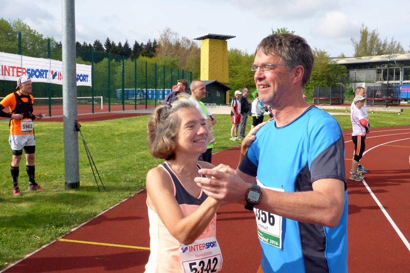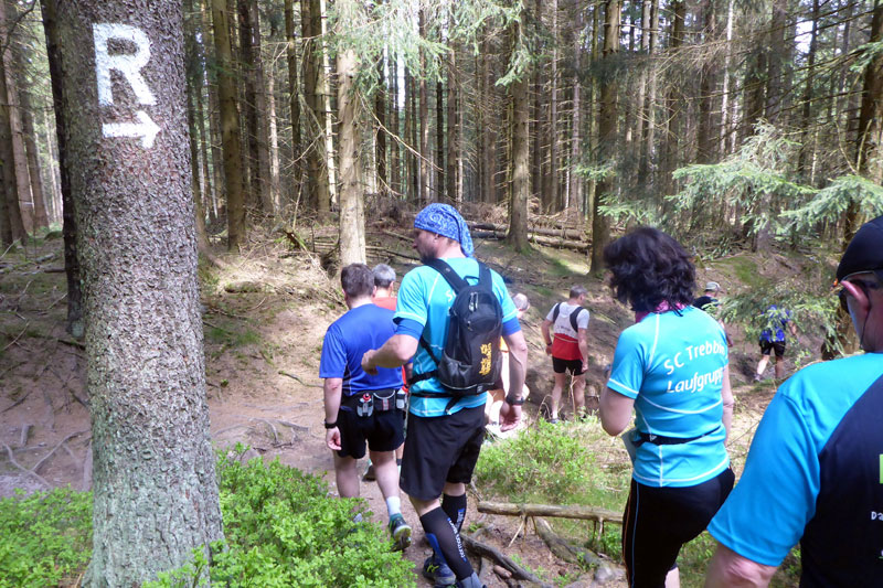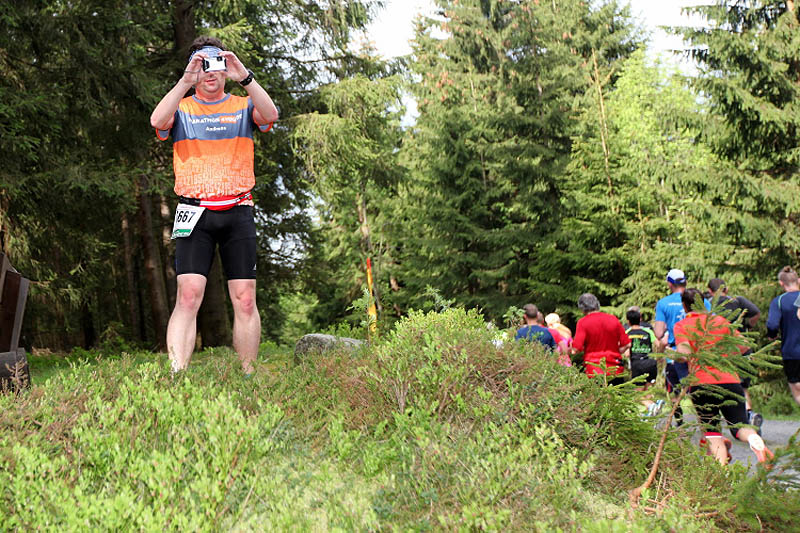 Schon nach wenigen Metern im Wald kann ich am Streckenrand zwei bekannte Gesichter hinter ihren Kameras entdecken. Es sind Norbert Wilhelmi und Klaus Duwe. Kurz darauf werde ich von einem jungen Mitläufer angesprochen, der mich an meinem Shirt als M4Y-Reporter erkannte. „Du, sag mal, war das da hinten der Herr Duwe?“ Ich bestätigte seine Vermutung. Da bekommt er glänzende Augen und erzählt mir, dass sein allererstes Laufbuch das von Klaus (42 mal 42) ist. Er habe sich damals nicht vorstellen können, wie man so viel laufen kann.