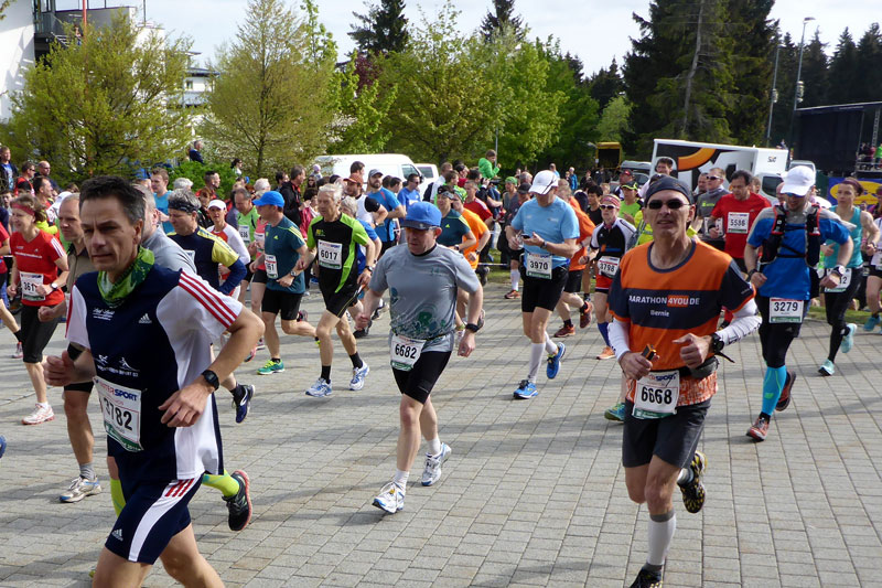 Plötzlich setzen sich die über 3600 Menschen um mich herum in Bewegung und ich werde daran erinnert, dass es hier ja um den Rennsteig-Marathon geht. Schon nach wenigen Metern verabschiede ich mich unter dem Applaus hunderter Zuschauer aus dem Sportgelände von Neuhaus. Jetzt geht es im Ort erst mal heftig bergauf und ich muss gleich mal ordentlich schnaufen.