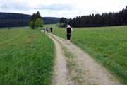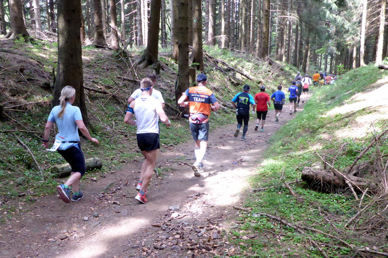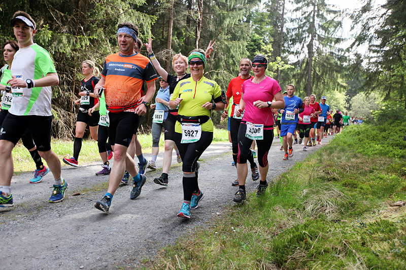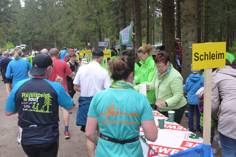 Schon bald lassen wir Neuhaus hinter uns. Auf der für den Straßenverkehr gesperrten Bundesstraße 281 geht es stetig leicht bergab in Richtung Limbach. Wer auf dem Teer nicht laufen mag, kann auch einen Trailpfad nutzen, der parallel zur Bundesstraße verläuft. Kurz vor Steinheid erreichen wir bei Kilometer 5,8 die erste Verpflegungsstation an der Steinheider Hütte, dann sind wir auf dem Rennsteig.