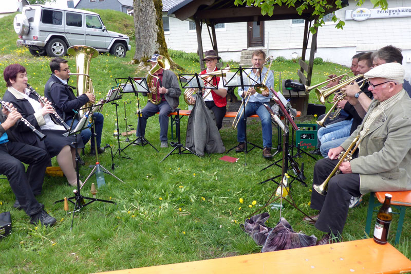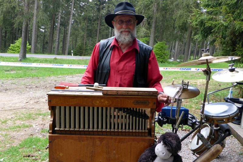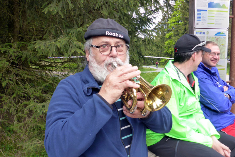 Das Prozedere vor dem Start ist ja legendär und ich habe fast das Gefühl, mancher Läufer ist nur deshalb hier. Zunächst einmal wird allen gratuliert, die heute Geburtstag haben. Dazu stimmt die Blaskapelle „Happy Birthday“ an und alle singen mit. Danach wird das „Rennsteiglied“ angestimmt, Thüringens heimliche Nationalhymne. Ich bin weder textsicher, noch sängerisch begabt, halte einfach meine Klappe und sauge die Stimmung auf. Wer denkt, dass es jetzt endlich auf die Strecke geht, entlarvt sich als Rennsteig-Rookie. Alle anderen wissen nämlich, dass jetzt der Schneewalzer kommt. Es wird untergehakt, geschunkelt und gesungen und getanzt. Da würde selbst Karl Moik vor Neid erblassen, denn die Stimmung im Musikanten-Stadl kommt da nicht mit.