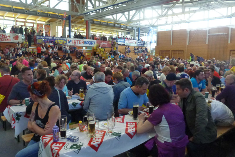 Die Halle ist am Abend proppenvoll und so müssen wir natürlich auch eine längere Schlange vor der Essensausgabe in Kauf nehmen. In Neuhaus gibt es traditionell Rindsroulade mit den berühmten Thüringer Kartoffelklößen und Blaukraut, während ja in Eisenach beim Fleisch als Variante immer Gulasch angeboten wird. Schmecken tut es überall gut.