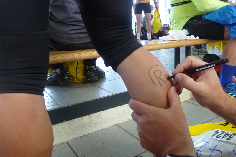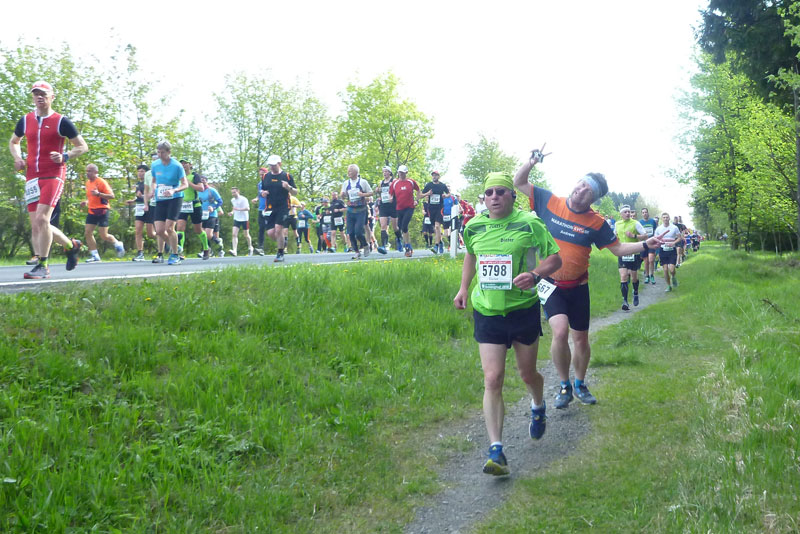 Aber sehr erfreulich für mich, ich bekomme gleich als Option die Möglichkeit: Asphalt oder Trail? Neben der Bundesstraße führt auch ein schmaler Wanderpfad entlang. Die meisten im Starterfeld beschäftigt diese Frage zwar nicht, sondern rollen sich erst einmal gemütlich auf der topfebenen Teerstraße ein. Aber ein paar Unentwegte, vielleicht auch Trailfreunde wie ich, wählen die weichere Alternative. Nach ein paar hundert Metern ist diese Möglichkeit aber auch schon wieder erschöpft und wir müssen alle auf die Straße. Viele Rennsteigläufer kann man ausmachen mit dem aufgemalten Rennsteig-Logo auf ihren Wadeln.