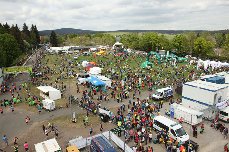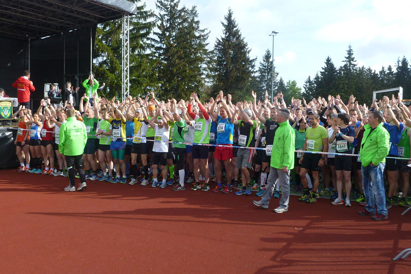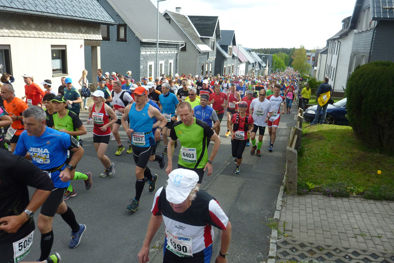 Auch der Veranstalter ist heute noch begeisterter als sonst, es gibt nämlich einen neuen Starterrekord zu vermelden, was man sich im Übrigen auch erhofft hatte durch die Korrektur der Strecke auf 42,195 km. Am Start stehen fast 3.300 Läufer und Läuferinnen. Nur zu DDR-Zeiten gab es mehr, da zählte man auch schon mal 5.000 Sportler. Aber nicht nur der Marathon boomt, auch bei der kompletten Rennsteiglauf-Veranstaltung konnten erstmals über 18.000 Anmeldungen verbucht werden.