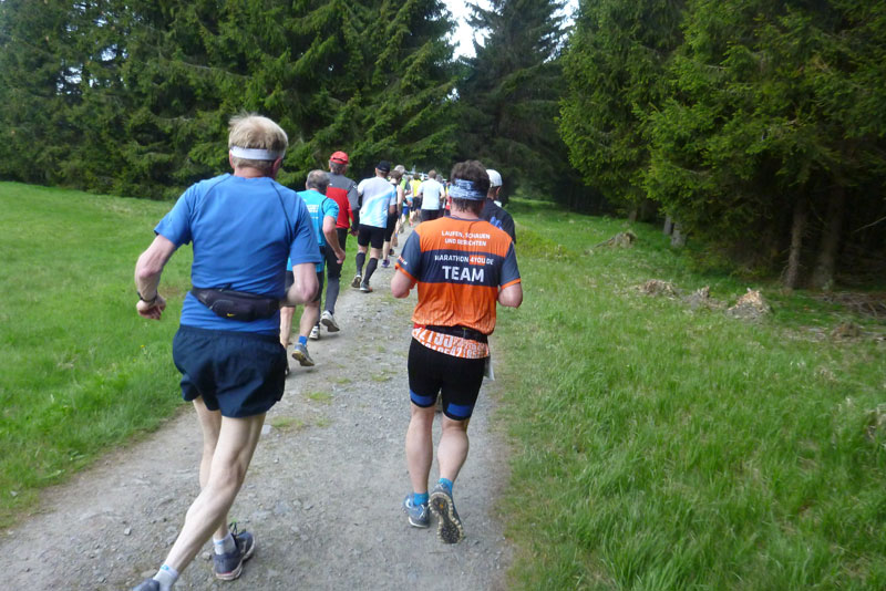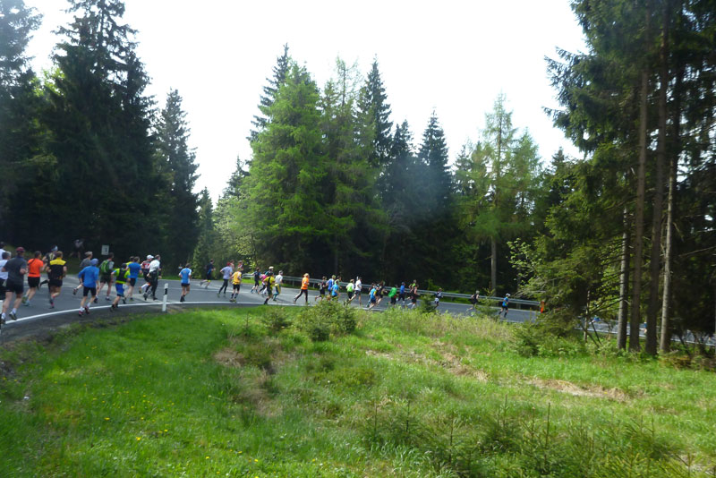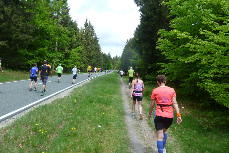 Blasmusik an der Triniusbaude begleitet uns bis zur Versorgung an der Schwalbenhauptwiese. Ja und dann geht’s wieder auf den „geliebten“ Asphalt. Aber… super, wieder gibt es die Wahl: Asphalt oder Teer? Für mich keine Frage, der schmale Pfad der Rundloipe Rotes Hoor der parallel zur Teerstraße läuft behagt mir doch deutlich mehr. Zwei Kilometer Landstraße kann man sich so ersparen. Glücklicherweise machen wieder nur wenige von der Möglichkeit Gebrauch. Fast durchgehend geht es leicht bergauf.