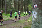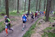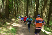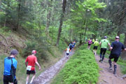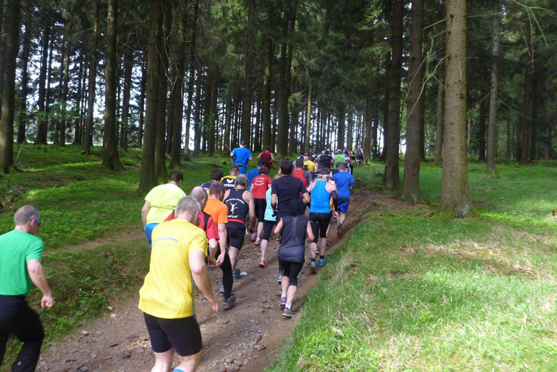 Direkt am Waldrand liegt eine Zeitmessmatte, die Hälfte der Strecke ist geschafft. Im Anschluss an die Halbzeitmessung geht es in den dichten Wald auf technisch deutlich schwierigeres Terrain, was vielen auch spürbar zu schaffen macht. So sind kleinere Staus in dem Hohlweg vorprogrammiert und wir kommen alle nur noch relativ langsam voran. Optisch und Lauftechnisch ist dieser Abschnitt wieder ein Trail-Hochgenuss. In der Rinne geht es fast nur abwärts, abschnittsweise kann man aber auch nach oben an den Rand ausweichen. Um schneller voran zu kommen, bringt es aber nichts. Aber ist trotzdem herrlich.