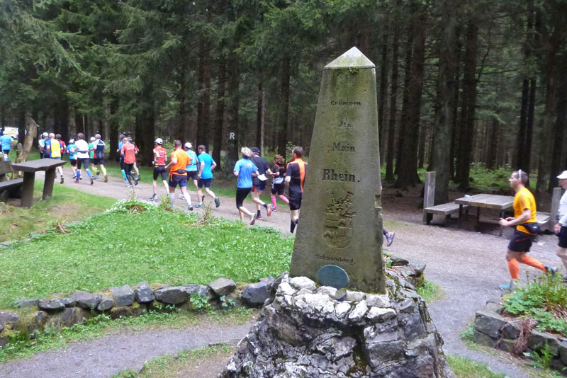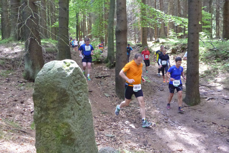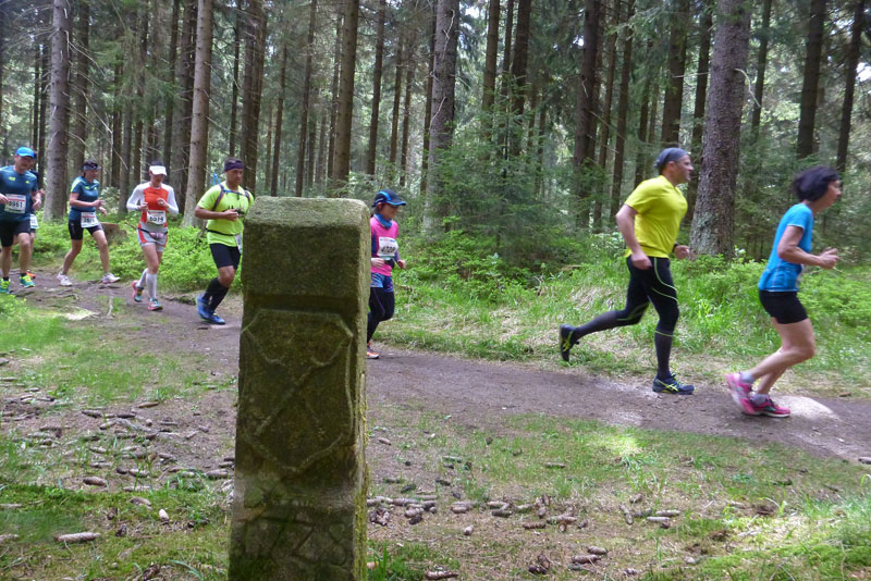 Den Großen Dreiherrenstein erreichen wir bei km 33,4. Neben unserer nächsten VP ist hier ein Kreuzungspunkt mehrerer alter Handelswege, der früher auch Pass- und Zollstation zugleich war. Die Markierung stellt zudem den Mittelpunkt des Rennsteiges dar, der mit seinen 168 Kilometern der älteste zusammenhängende Höhenwanderweg des Thüringer Waldes ist. Neben dem Rennsteig hier, gab es im gesamten deutschen Sprachgebiet mehr als 200 Rennsteige und Rennwege, die teilweise noch älter sind. Rennsteig ist also kein Eigenname, sondern ein Gattungsname. Rennsteige waren Wege zur raschen Fortbewegung und im Unterschied zu den Heerstraßen schmale Lauf- und Reitwege für Boten und Reiterscharen.