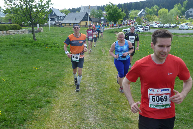 Jetzt wird aber gelaufen, pünktlich geht’s um 9:00 Uhr los. Die ersten beiden Kilometer führen zwischen ein ganz ansehnliches Zuschauerspalier durch Neuhaus, von Beginn an geht es gleich merklich ansteigend los, zum Ortsende flacht dann alles wieder ab. Einen gravierenden Unterschied zum Supermarathon kann ich gleich zu Beginn ausmachen: Beim Marathon werden auch einige Kilometer auf Teerstraßen absolviert. So befinden wir uns nach dem Ortschild erst einmal für mehrere Kilometer auf der B 281 Richtung Steinheid.