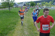 Auf dem Gipfel des Eselsbergs erreichen wir direkt unter dem 33 m hohen Aussichtsturm die nächste große Versorgungsstation. Schleim gibt es hier auch, aber leider wieder ohne Fruchtgeschmack, ich glaube diese Variationen findet man wohl nur an den Stationen des Supermarathons. Für einige ist hier auch die Behandlung ihrer malträtierten Muskulatur wichtiger, dafür wird von Physiotherapeuten gesorgt. Wer sich länger hier aufhalten will, der bekommt mit zünftiger Blasmusik auch Unterhaltung geboten. Meinen Geschmack trifft das nicht, schnell einen Schleim und eine Wurststulle und nix wie weg.