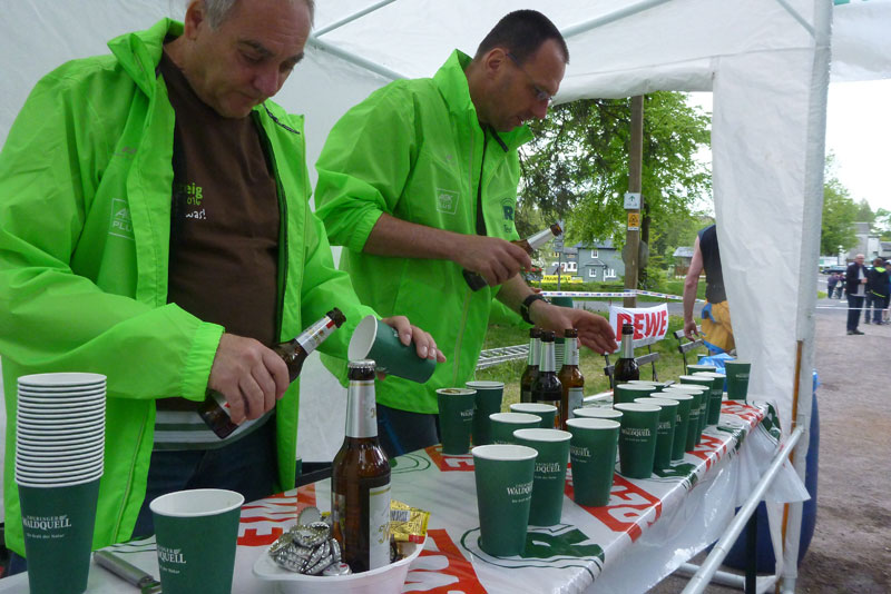Nach 37 km ist es dann endlich soweit. Mich dürstet ganz gewaltig und ich hab da was in Erinnerung. Wir erreichen die Versorgungsstation in Frauenwald. Hier wird das weitbekannte Thüringer untergärige Dunkle ausgeschenkt. Dem Schwarzbier wurde im 19. Jahrhundert eine besonders gesundheitsfördernde Wirkung zugeschrieben. In einer Anzeige von 1893 warb die Brauerei, es werde von „hohen medizinischen Autoritäten empfohlen für Rekonvaleszenten jeder Art“. Dazu zählen wir nach 37 knochenharten Kilometern natürlich auch und so kann das ja nicht schlecht sein. Oh Mann, das zischt und gleich geht’s wieder besser.
