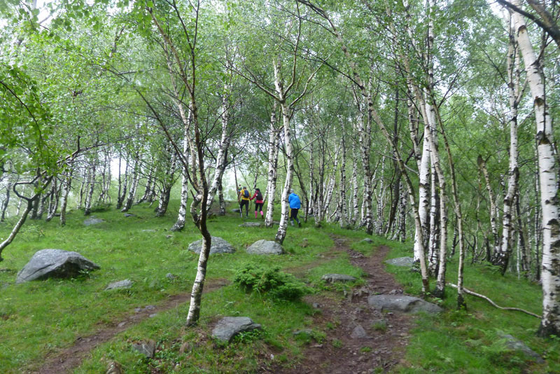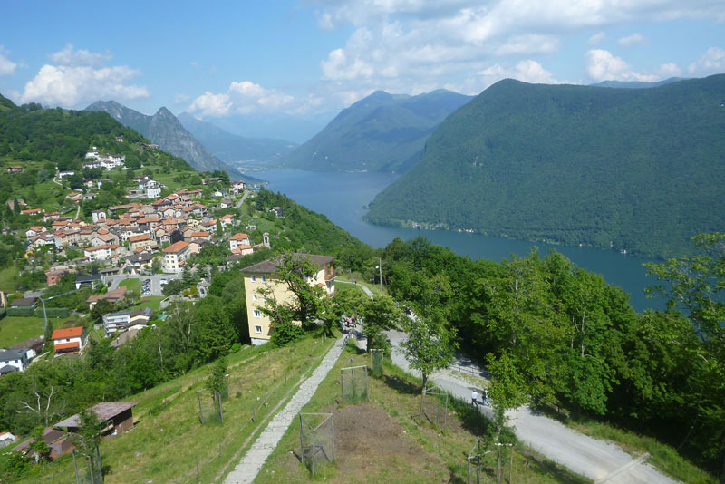 Über gepflasterte Wege, Wiesen und entlang der im Tessin üblichen Steinmauern geht es stetig nach oben. Kurz erhalten wir immer wieder erste Überblicke in den noch ziemlich wolkenverhangenen Landstrich der Capriasca, die überwiegend mit Birken- und Buchenwäldern bedeckt ist. Den Monte Bigorio erreichen wir nach genau 5 Kilometern. Mittlerweile hat es wieder aufgehört zu regnen, die Sicht hat sich deutlich verbessert und wir haben eine erstaunlich gute Sicht auf den Luganer See. Viele nützen diesen ersten Aussichtspunkt für Selfies und Fotoaufnahmen mit dem Golf von Lugano. Wer weiß, was noch kommt.