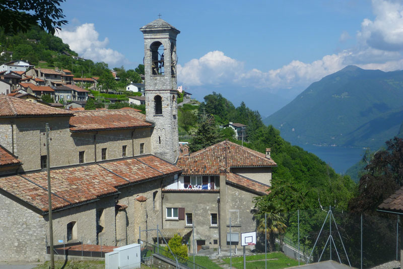Eine kurze Ehrenrunde drehen wir noch durch den Ortskern, vorbei an der Hauptsehenswürdigkeit von Tesserete, der Pfarrkirche San Stefano. Ihr romanischer Glockenturm ragt siebengeschossig aus der Mitte der heutigen Kirchenfassade empor. Dann beginnt nach einem Kilometer der Aufstieg in höher gelegene Orte. Es fängt wieder zu regnen an, hektisch packen einige ihre Regenjacken wieder aus.