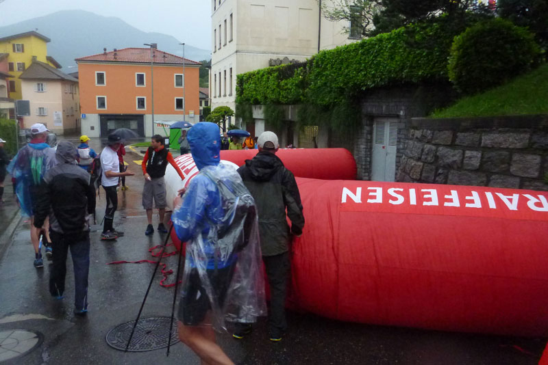 Als Startzeit ist 7:00 Uhr vorhergesehen. 30 Minuten vor dem Start sollte eigentlich ein Briefing stattfinden. Hier ist nichts. Ich marschiere zum Startplatz in die Stadtmitte, auch hier haben sich nur ganz wenige eingefunden. Ich frage einige Deutsch sprechende, niemand weiß etwas. Ich bin bereits durch die Regenjacke nass, lege noch einen Plastikponcho an. Kurz vor 7 Uhr beginnt man erst mit dem Aufbau des aufblasbaren Startbogens. Ist man hier wirklich so locker drauf: Dolce Vita in Ticino oder so ähnlich? Oder habe ich irgendwas verpasst? Um 7 Uhr geht ein Micro an: La partenza delle gare 54K e 24K é ritardata alle 8h00. Später noch übersetzt ins Englische: Der Start ist auf 8 Uhr verschoben. Die Startverschiebung wurde per Mail bereits um 6 Uhr versandt. Die Mail lese ich, als ich wieder zu Hause bin …
